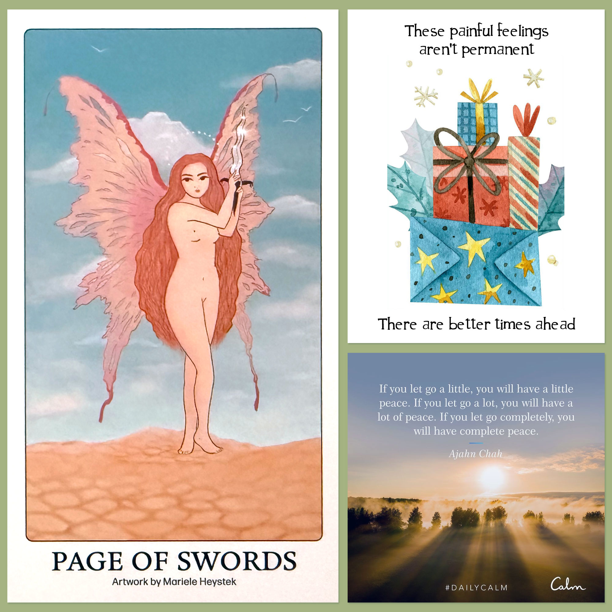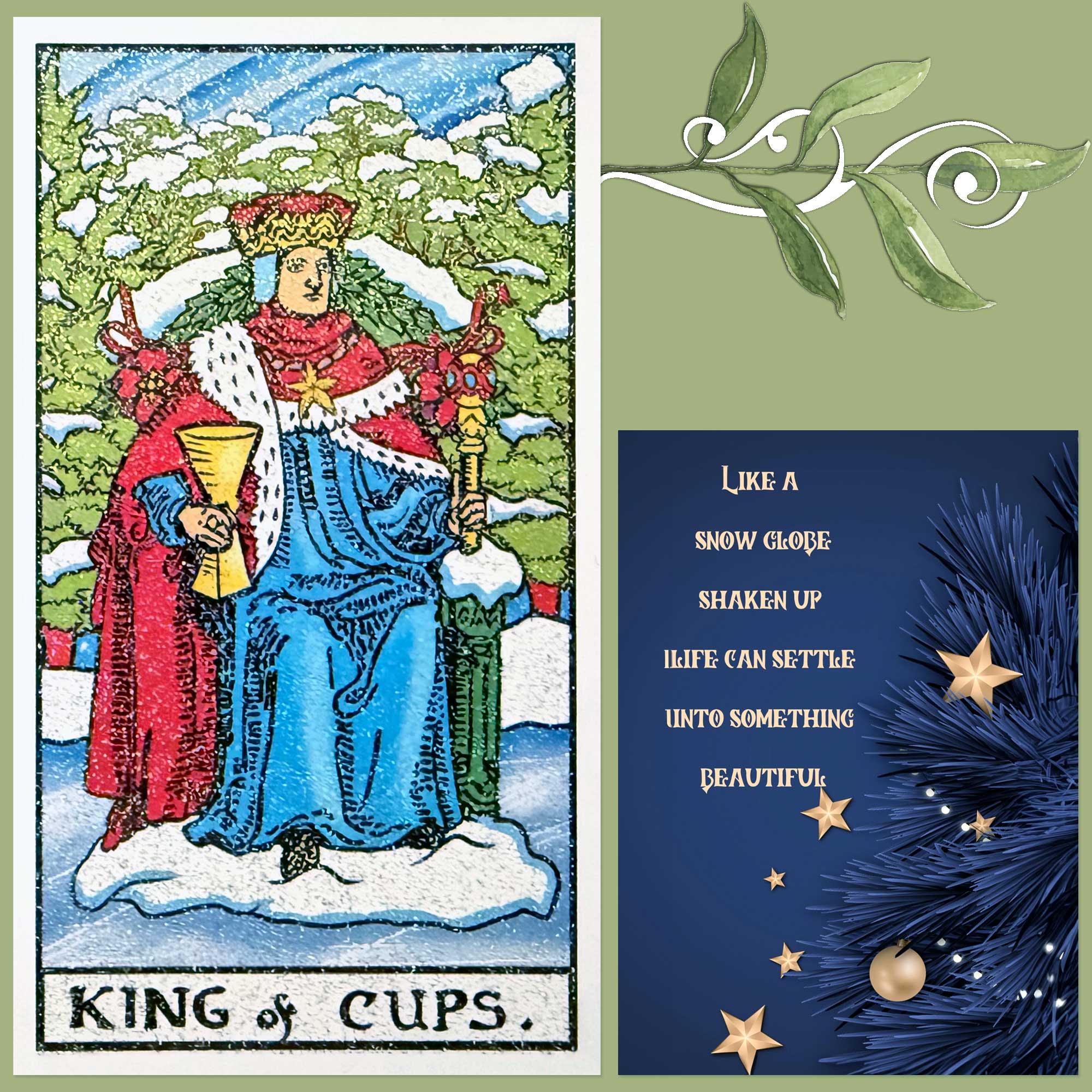 The King of Cups has then been combined with one of my Christmas Affirmation cards, which says, “Like a snow globe shaken up, life can settle into something beautiful.”