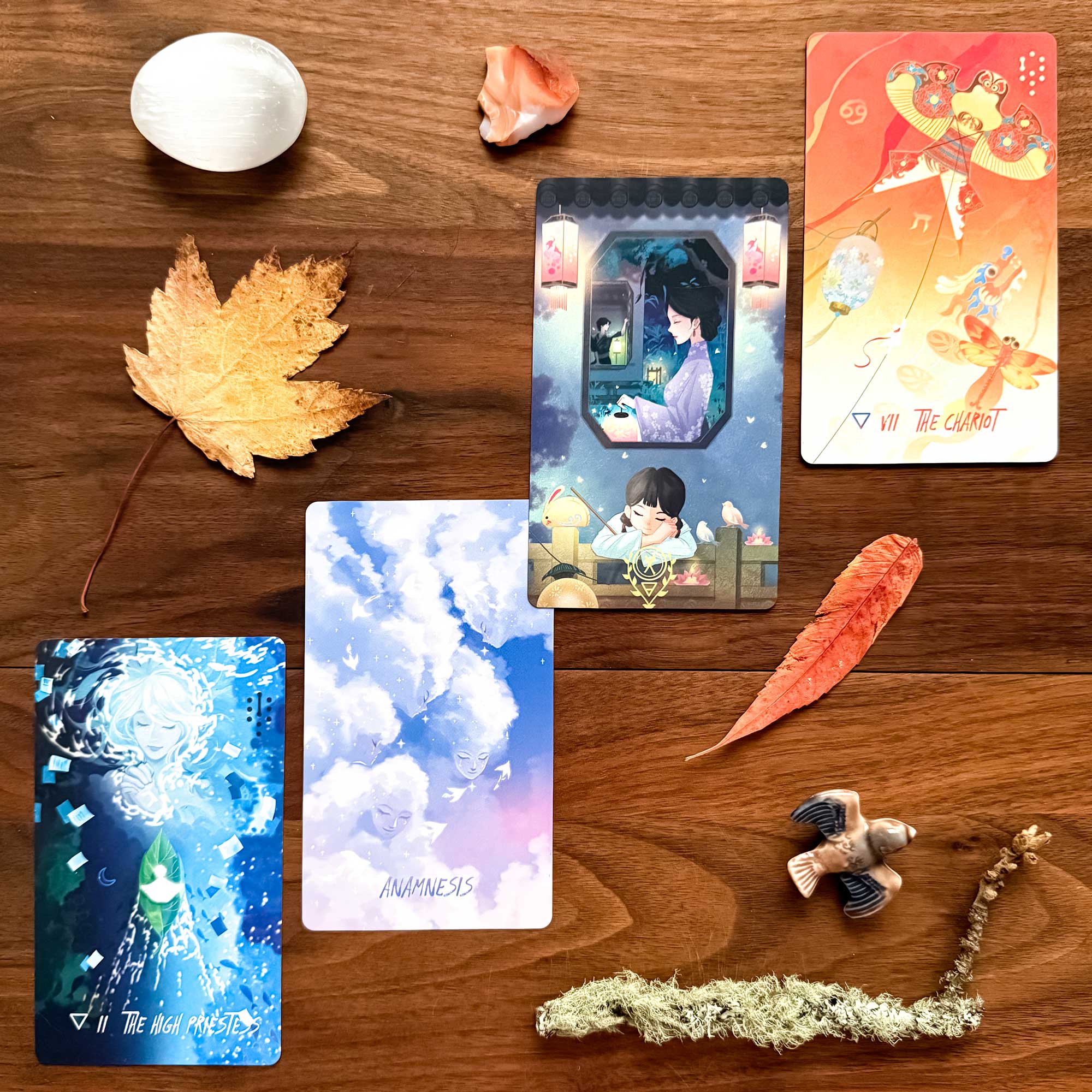 Reading Summary – We relate to love through how we have experienced security and contentment in our past lives (Ten of Earth atop Anemesis). This secret knowledge (The High Priestess) is the driving force concerning how we experience love in the present (The Chariot flying off to the right/future).