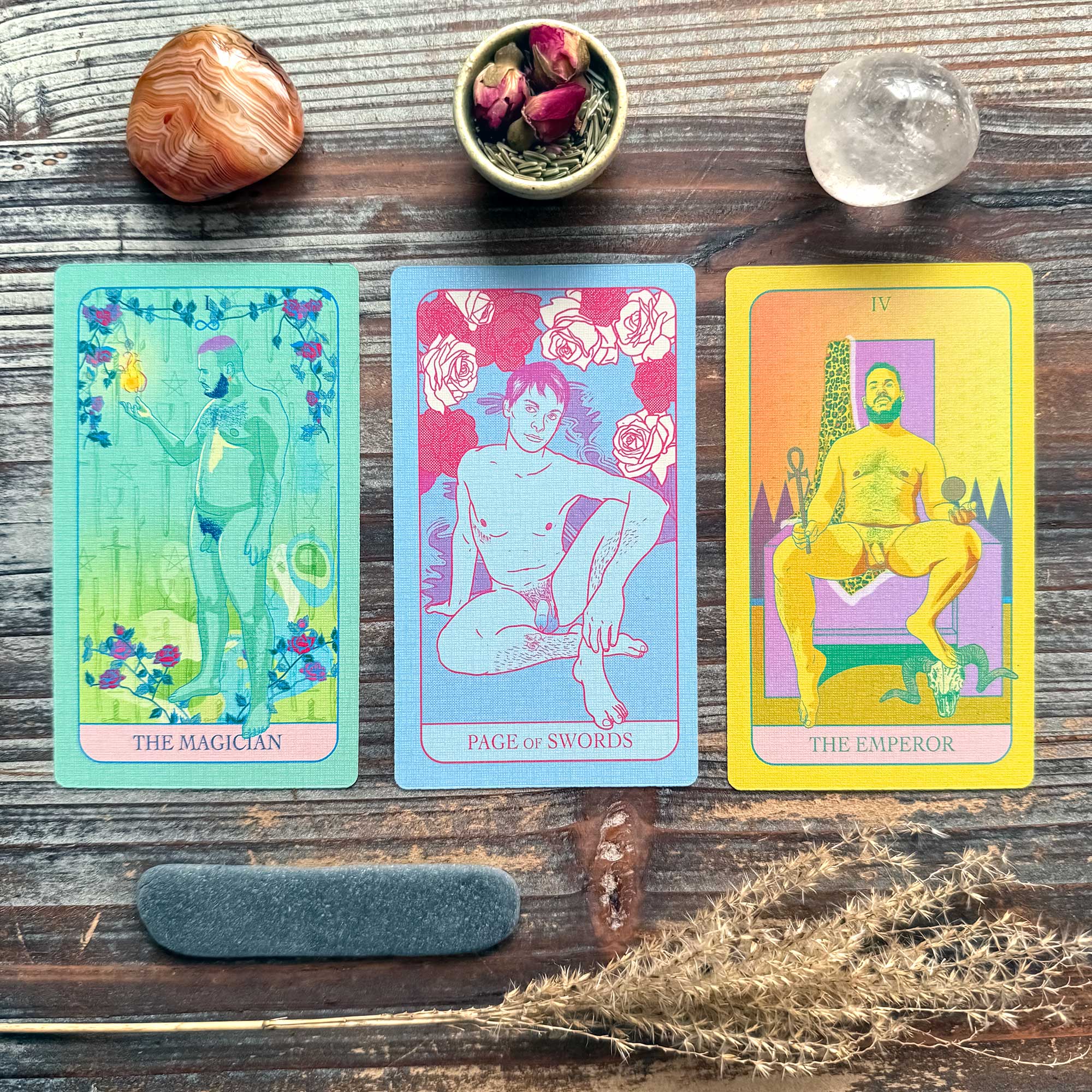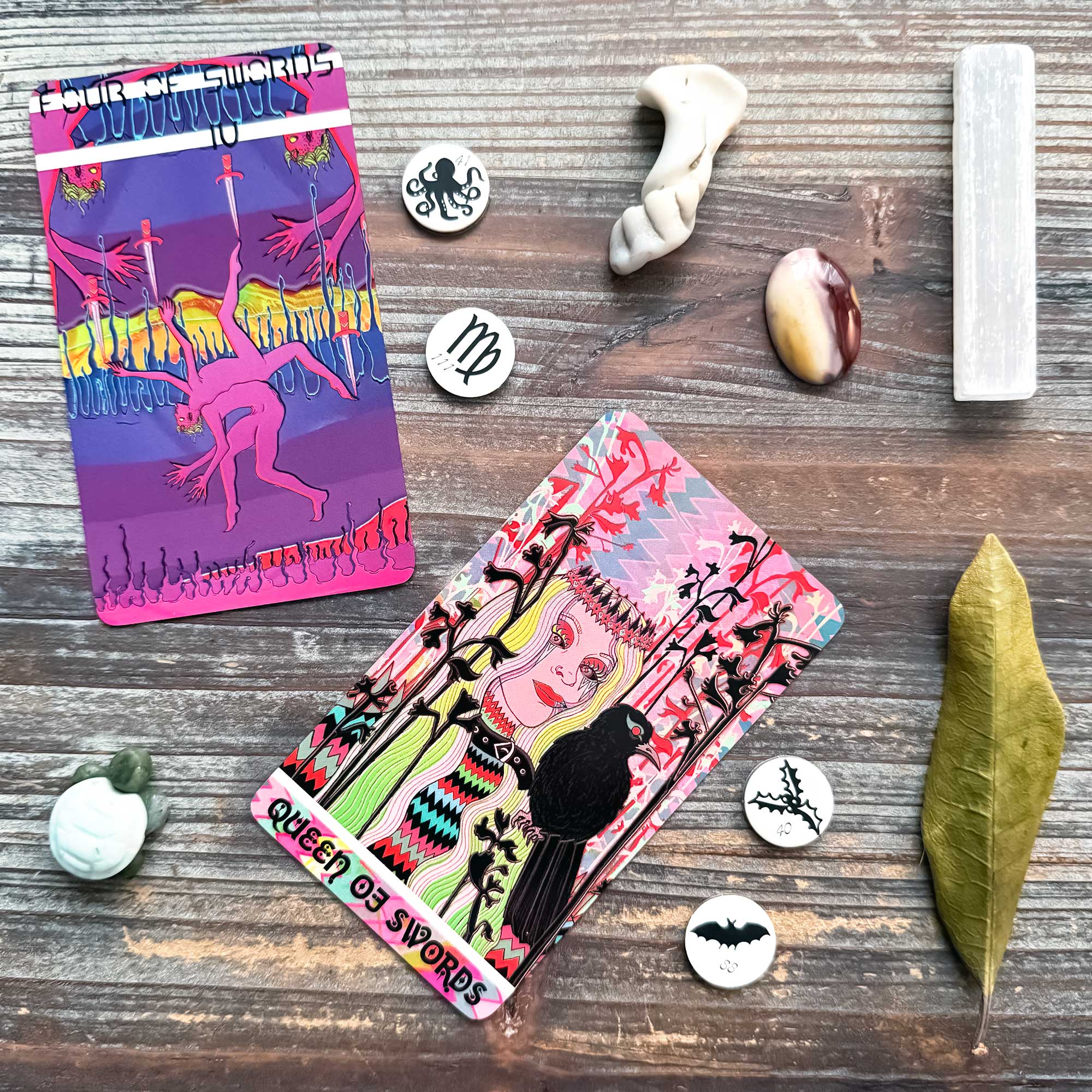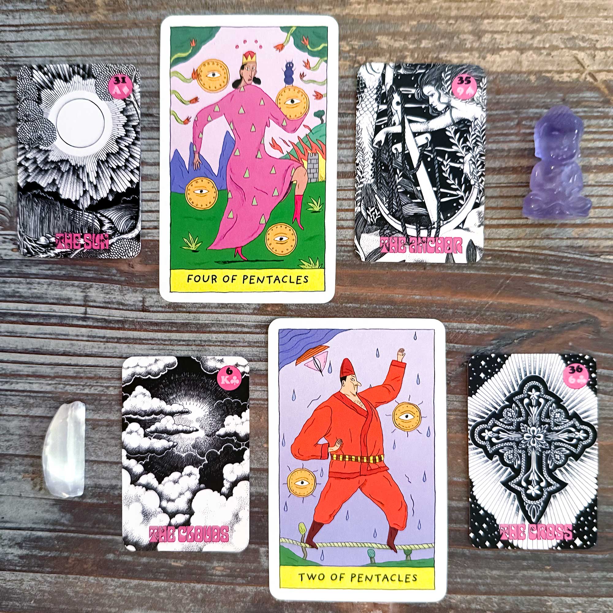 Even if alone time (The Hermit) isn’t possible or safe right now, getting out into the world (The World) and specifically out into nature (background of the Knight of Pentacles), can help you find the grounding you need (staring at the drop in The Hermit card is reminiscent of meditating by watching water dripped down the side of the shower wall), allowing you to unwind and relax a bit.