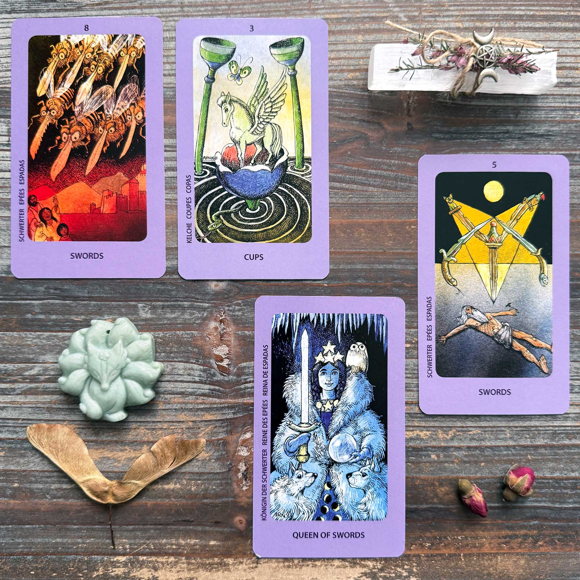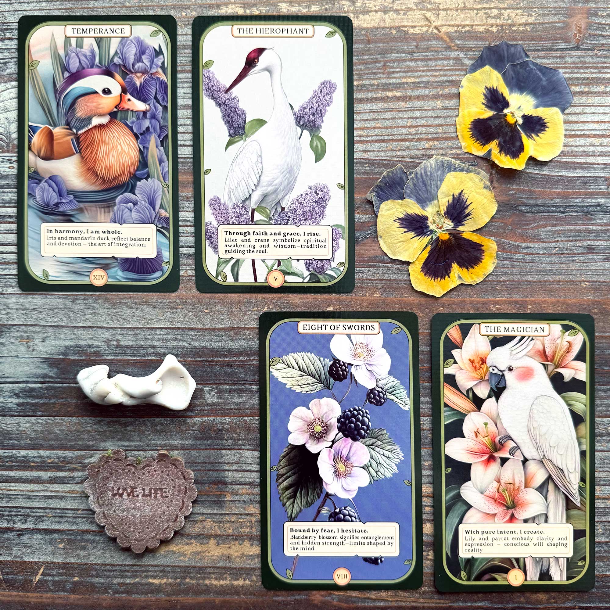 Temperance and The Hierophant – Remember that the Iris flower and the Mandarin Duck may reflect balance and devotion, but the Iris also attracts snakes. By the same turn, just as the Lilac flower and the Crane may symbolize spiritual awakening and wisdom, the Lilac flower also speaks of Spring and the crane of enhanced awareness.