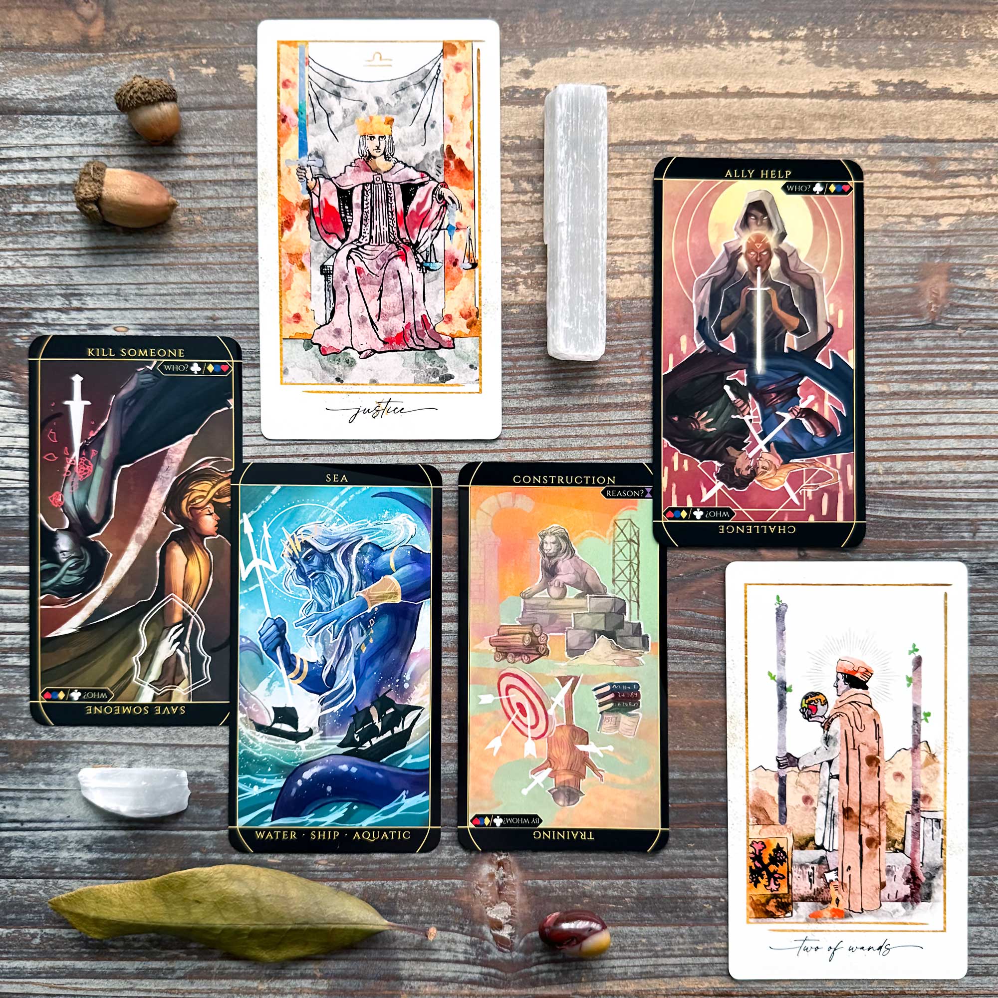 Reading Summary – The figure in the Seven of Swords appears to be looking up at the harlequin in the Anchor Card and her jackals, the wink speaking of being in cahoots with each other.