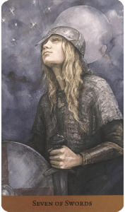 Today’s draw is the Seven of Swords, and has to do with progress, the unknown, and/or a leap ahead in the area of thoughts and communication.