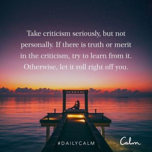 Today’s meditation was ten minutes long, And focused on how to deal with criticism in a way that is excepting and calm, rather than taking immediate offense.