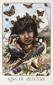 In the King of Zephyrs, what pulls to my intuition is the butterflies and the dead mouse, secondary comes with how the two hawks face each other, and the presence of the thistle along the bottom of the card, which is commonly a representation of aggression and pain, protection, and pride.