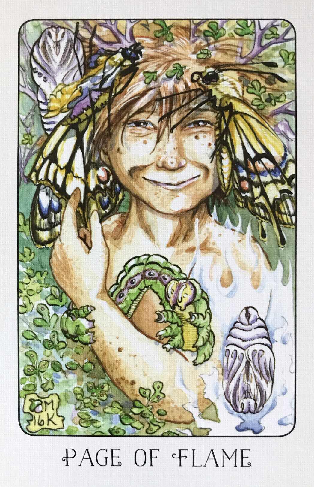 That said? I think this deck’s card is a spectacular representation as well. In this card I see the transformative power of life and positivity. The caterpillar, the chrysalises, the butterflies in his hair. The new buds of growing rack reaching up from the top of his head. The lush carpet of new green sprouts. All of it speaks to me of a time of newness, transformation, and growth.