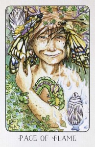 In my mind, I always see the Page of Wands (Page of Flame in this deck) as a boy with a huge and infectious smile standing proud on a hilltop with a bonfire behind him and sparks flying up into the air around him in all directions. I’m pretty sure this isn’t from any deck I’ve seen but is, instead, simply my own mental image of that card’s energy.
