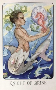 What I see when I look at this card is a fierce warrior in a moment of gentleness and communion. The shark boy is clearly a creature of strength, and even the expression on his face speaks of a warrior’s spirit, and yet he holds one of the most delicate creatures of the sea in his hand, communing and communicating with it (as shown by the seaweed that is surrounding them each.
