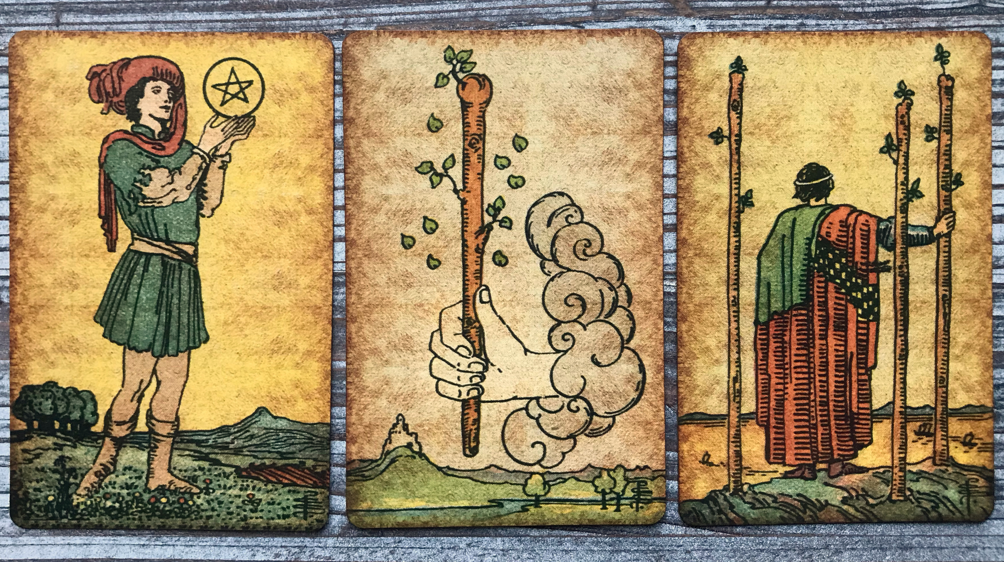 Reading Summary: When there’s too many good ideas (Ace of Wands) and too much planning to be done (Three of Wands), and yet I feel like a novice and like I don’t know my shit (Page of Pentacles).