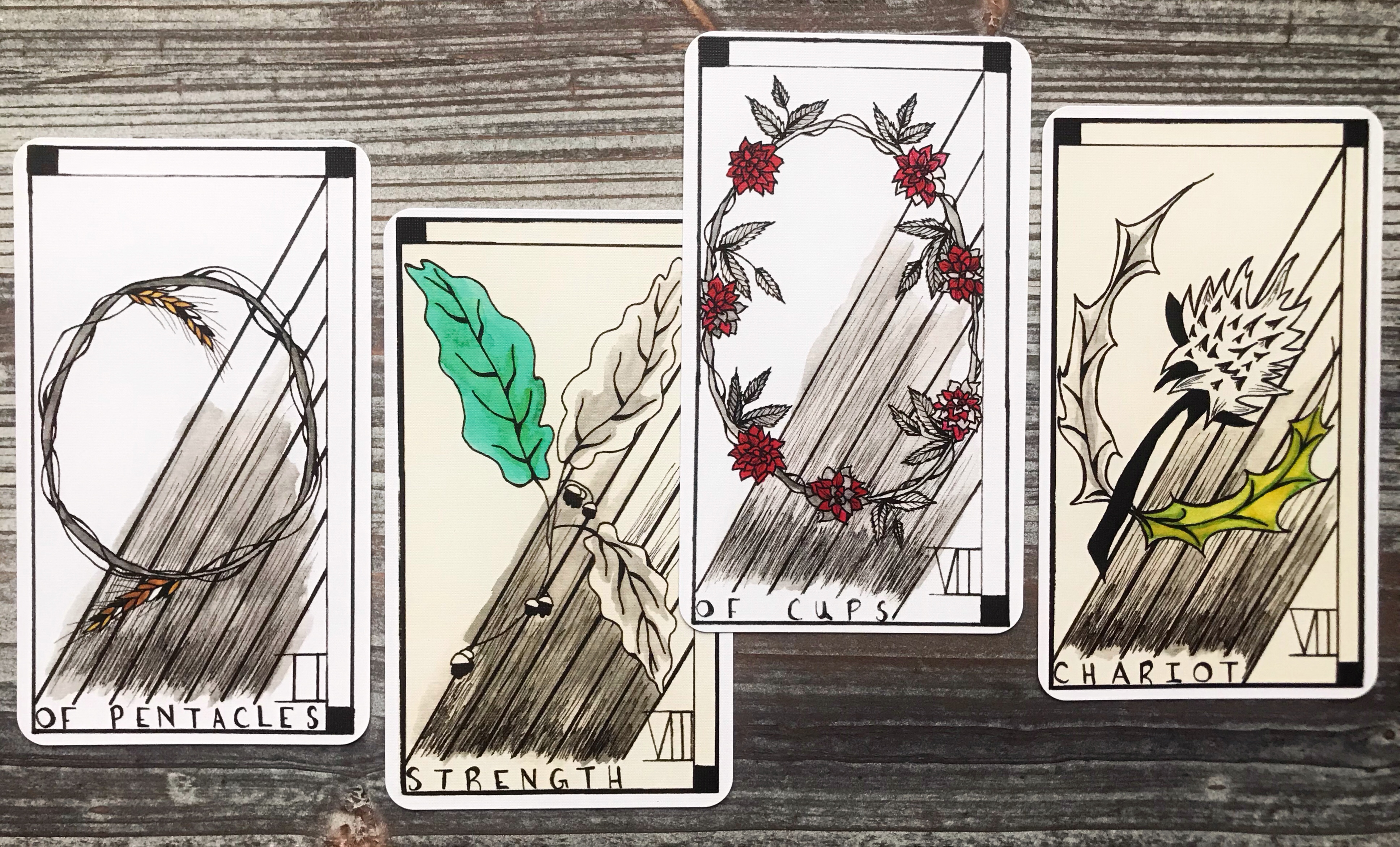 Reading Summary: There is strength (Strength) in knowing when to set aside (Seven of Cups) the struggle of juggling too much (Two of Pentacles) in order to focus on gripping the reigns on chaos (The Chariot).