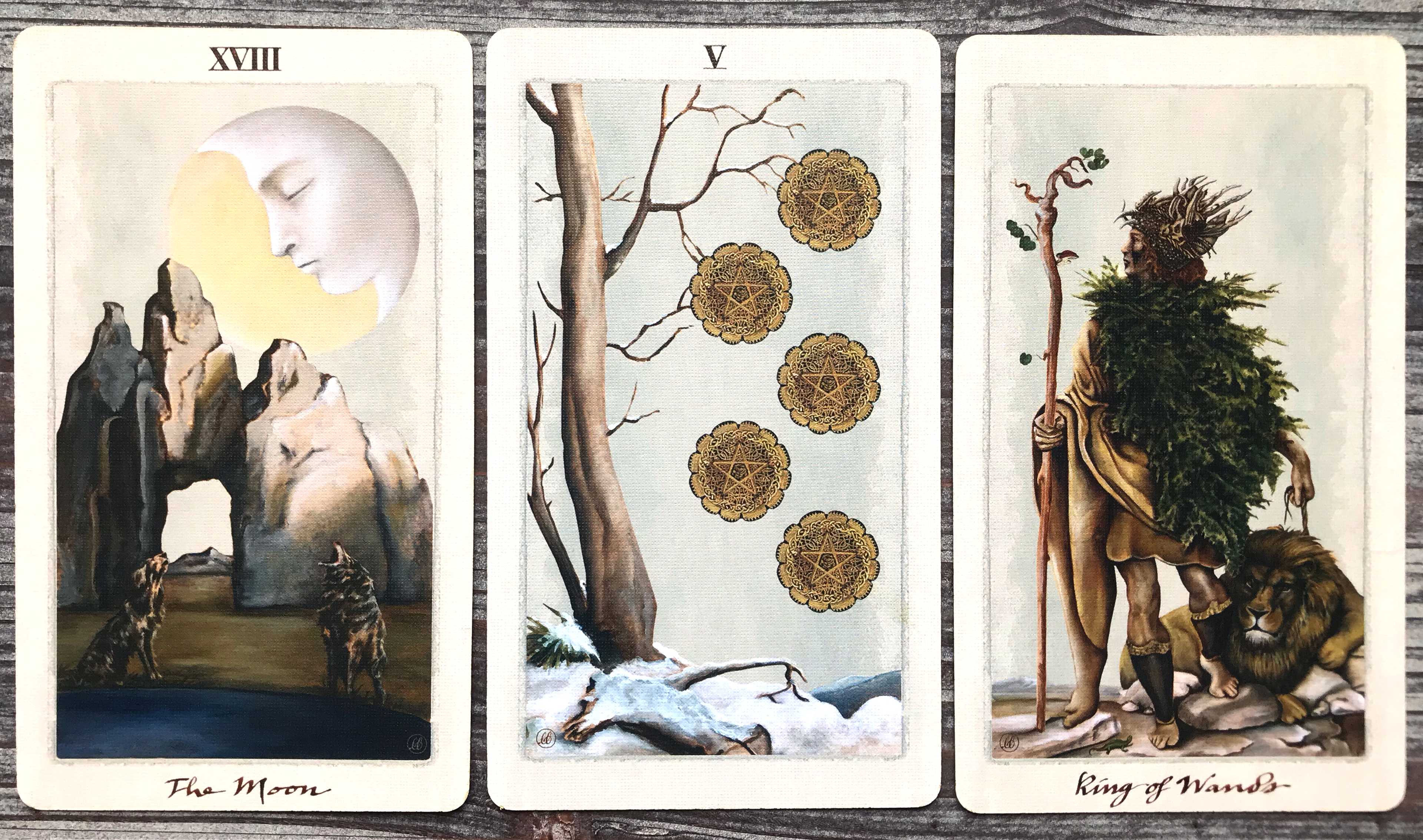 Reading Summary: When I’m feeling uncertain of where to place my feet (The Moon) and the world feels like it’s falling apart around me (Five of Pentacles), remember to have faith in that inner spark of passion that drives me forward (King of Wands) as my real strength lies within the determination that lives there (the Lion in the King of Wands).