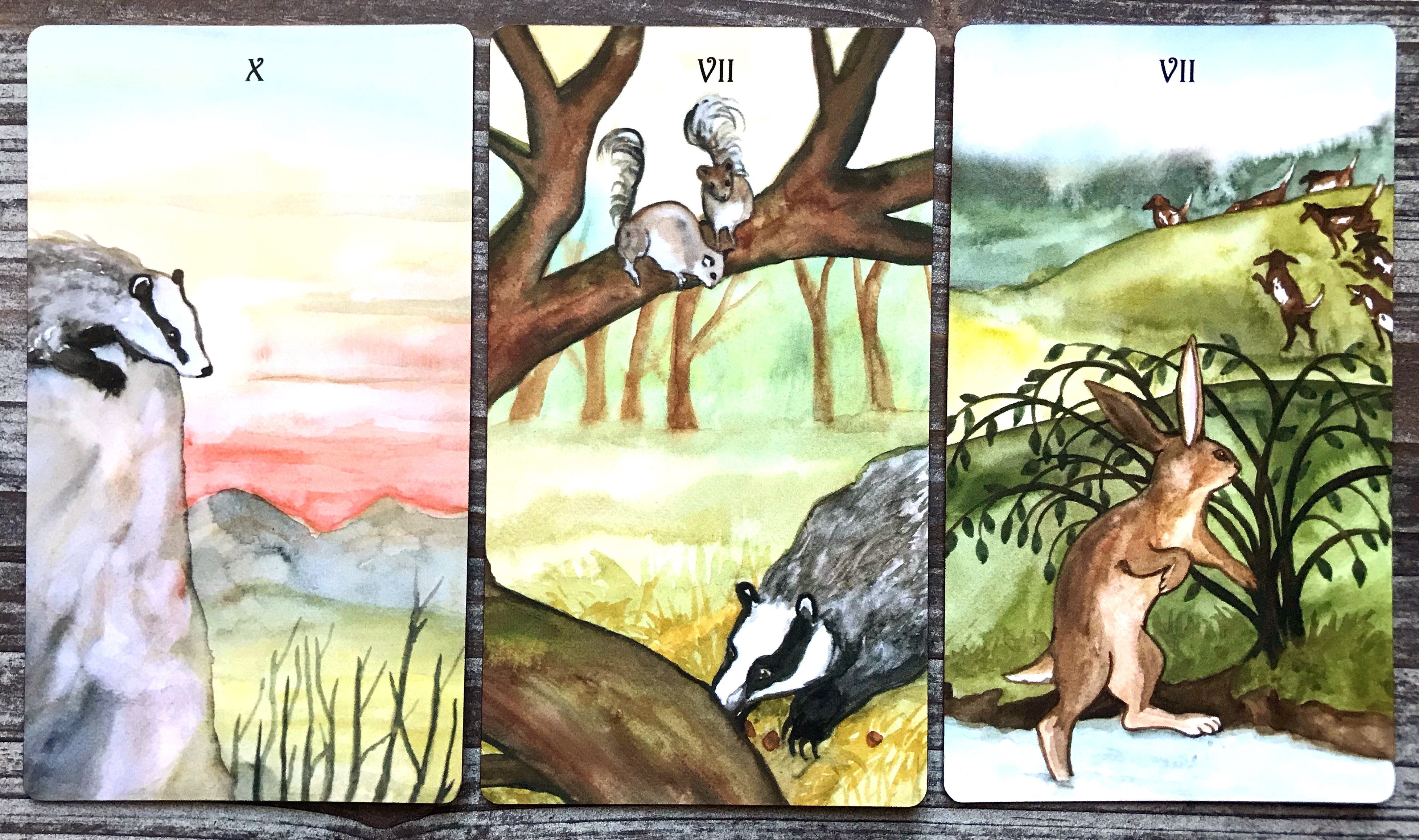 Reading Summary: This reading is a 100% intuitive hit off of card imagery (rather than read by traditional interpretation of the suits)… If I’m feeling overwhelmed (Ten of Badgers) and like it’s me against the world (Seven of Badgers), then I am doing myself a disservice by taking on more at that time (Seven of Rabbits).