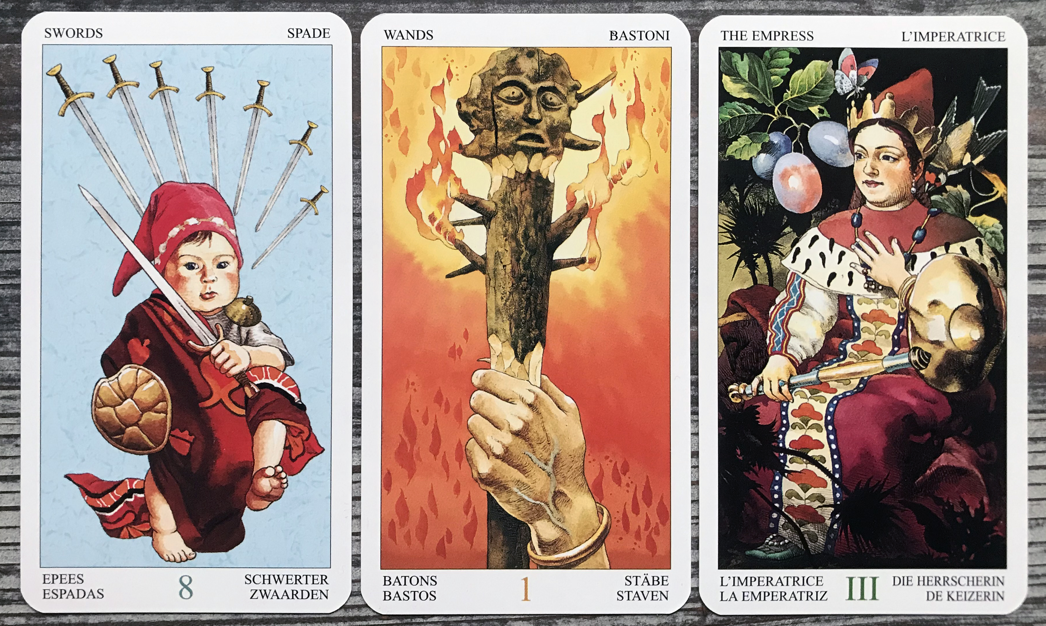 Reading Summary: Neglecting my inner needs (Eight of Swords) in order to chase after my constant ambition and spark of new ideas (Ace of Wands) and putting my own self care on the back burner (The Empress).