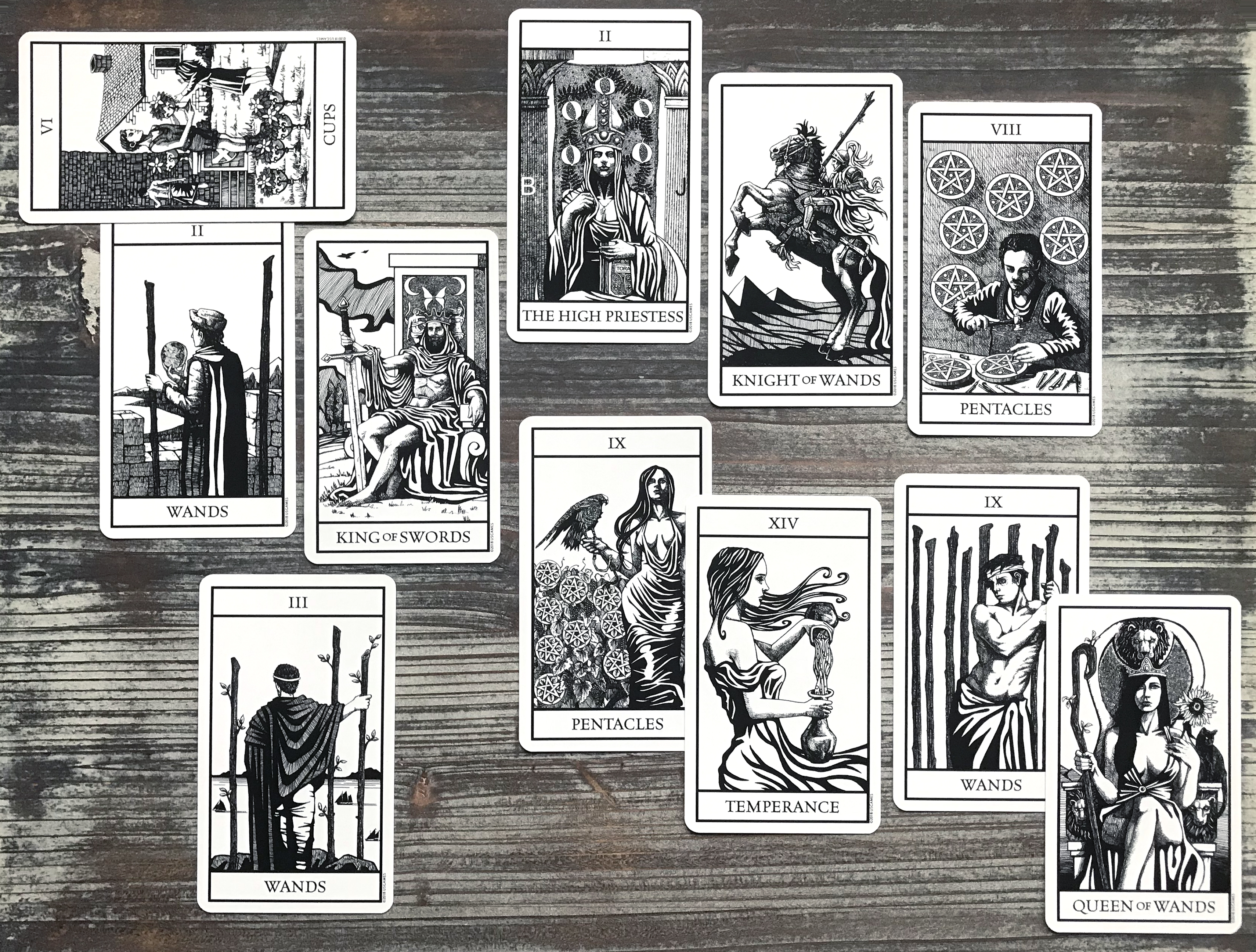 Using his knowledge of the land, he plots a course to freedom from the dark wood (Three of Wands) that will take him back on course to the adventure he seeks. Unfortunately, as he seeks the path that will take him back to the light of day, what he finds is that instead he ends up wandering deeper and deeper into the woods (High Priestess) until he begins to doubt himself and the way forward.