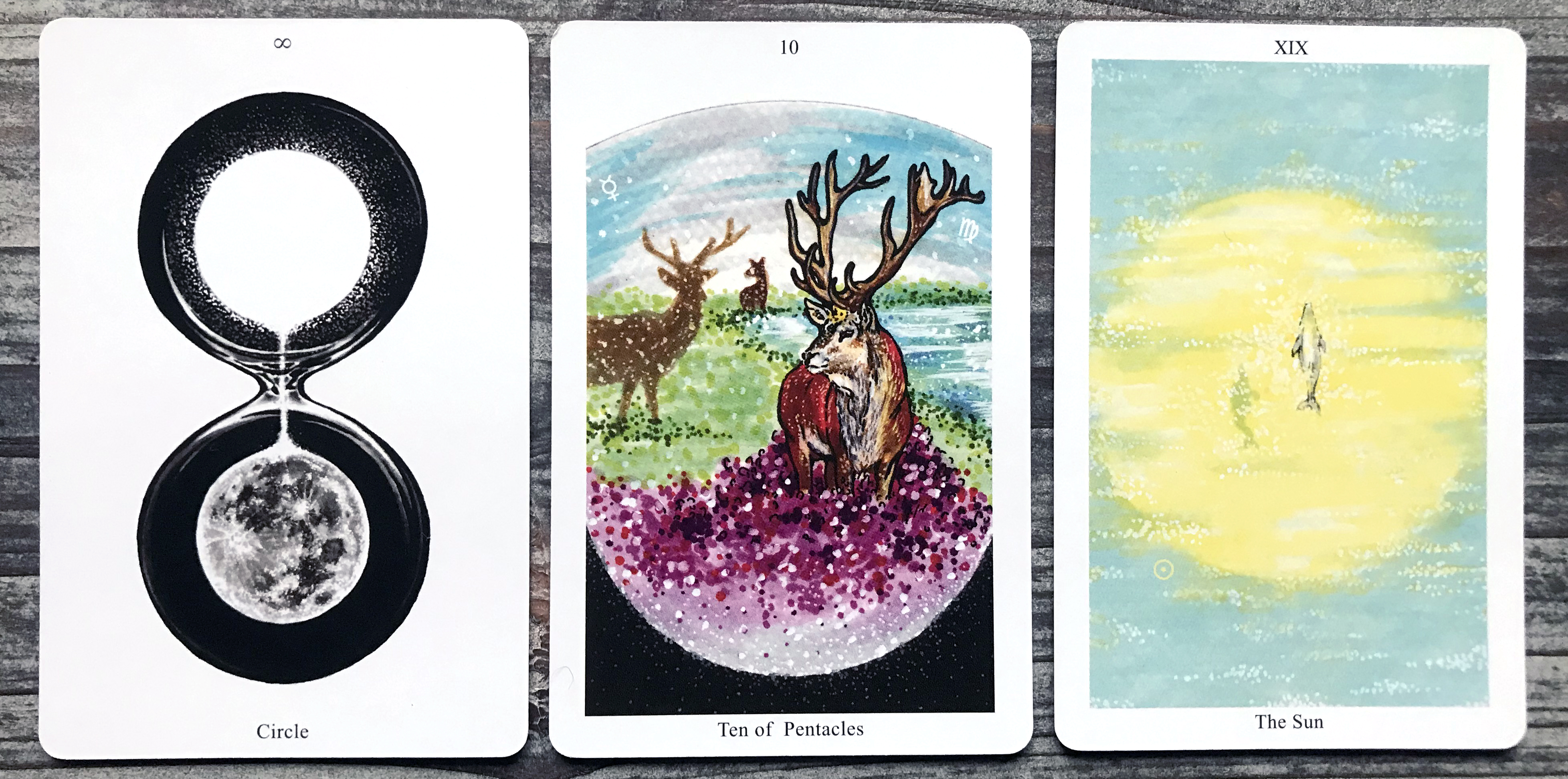 Reading Summary: Time spent in liminal spaces (Infinite Circle) within the deep forest (Ten of Pentacles) brings me happiness (The Sun).