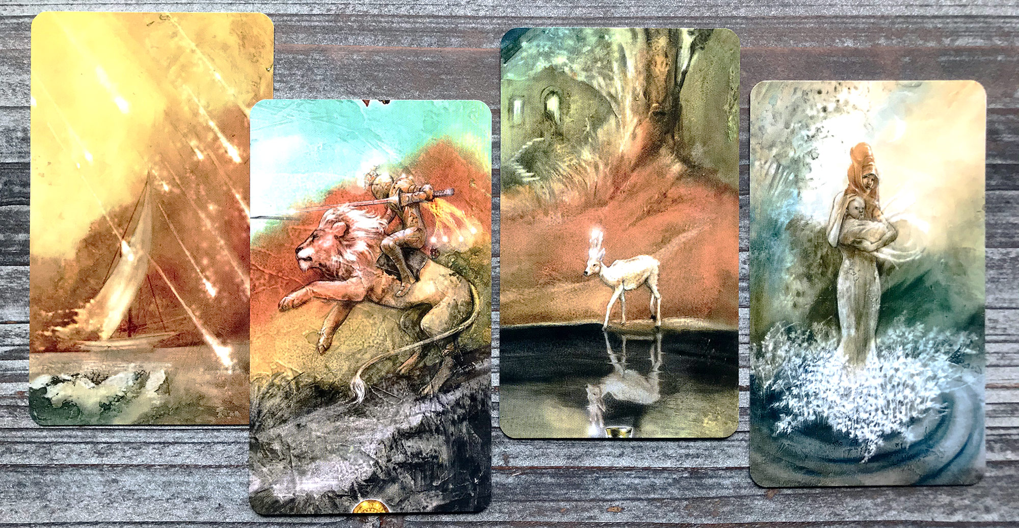 Charging into the fray and chaos (the two left cards speak of chaos in the first and fearless confrontation through the knight on the lion in the right) with a calm heart and mind (the center card is filled with warmth but also with a good deal of tranquility is translated through calm waters and the presence of the white stag) in order to foster and protect others (the right card portrays a figure protecting a more helpless figure in the cradle of their arms with cool waters, calming colors, and ice crystals portraying a sense of balanced calm).