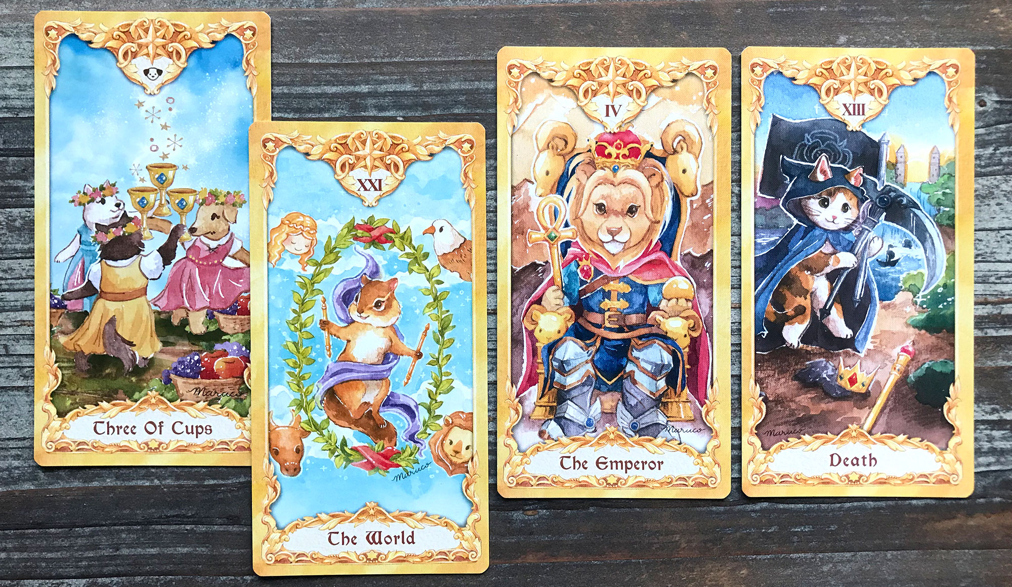 Reading Summary: My independence (Three of Cups Rx) and sense of purpose (The Emperor) that, through times of change (Death), allows me to ride through those changes in life and use them as an opportunity for growth (The World).