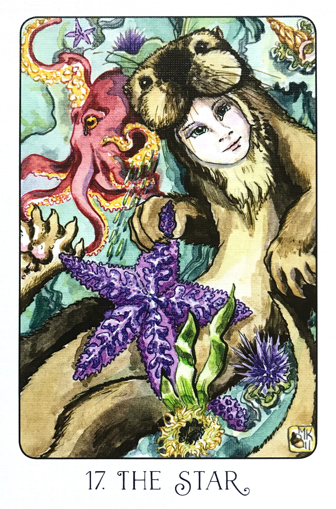 What I see in this card’s imagery is more than hope but comfort. In the imagery, the sea-otter boy lingers among the bounty of a tide pool, and surrounded among these creatures it has all that it needs. Land and sea, food and much more. Everything is looking up in the world for the otterboy.