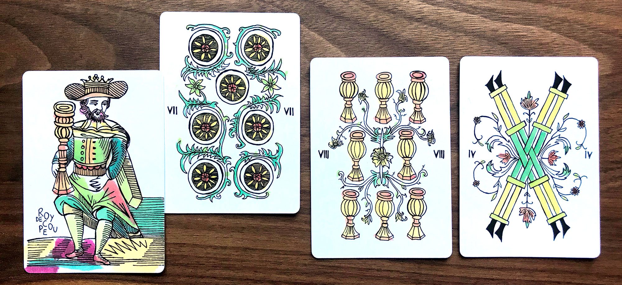 Reading Summary: Sometimes I seek council from others (King of Cups) to find the most sustainable path forward (Seven of Pentacles), but I’m not afraid to discard what isn’t working (Eight of Cups) for the sake of finding something better (Four of Wands).
