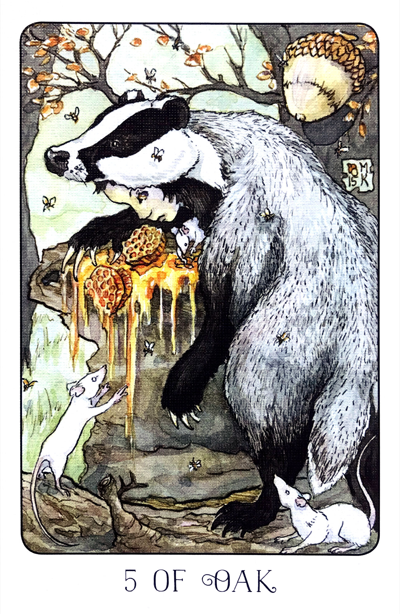 What really stands out to me today in this card is the mice and the honeycomb. Although the badger child hoards his honeycomb, there is enough to go around for all to partake. Sometimes when you’re in need, it’s hard to look up from your struggles to see where a helping hand may lie. These rats have chosen to look up and although the badger child wishes to keep all that goodness to themselves, they share regardless.