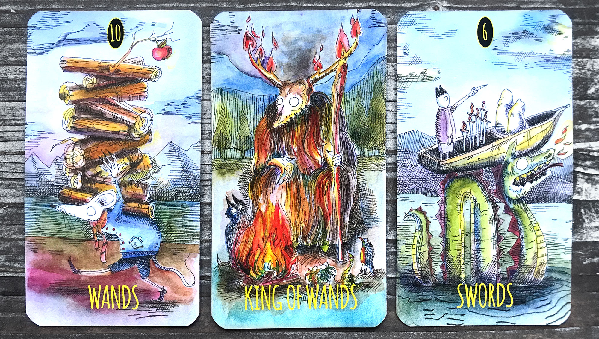 Reading Summary: When I’m feeling chaotic and defensive (Seven of Wands), taking some time to rest and reevaluate (Four of Swords) allows me to find balance once more (King of Swords).
