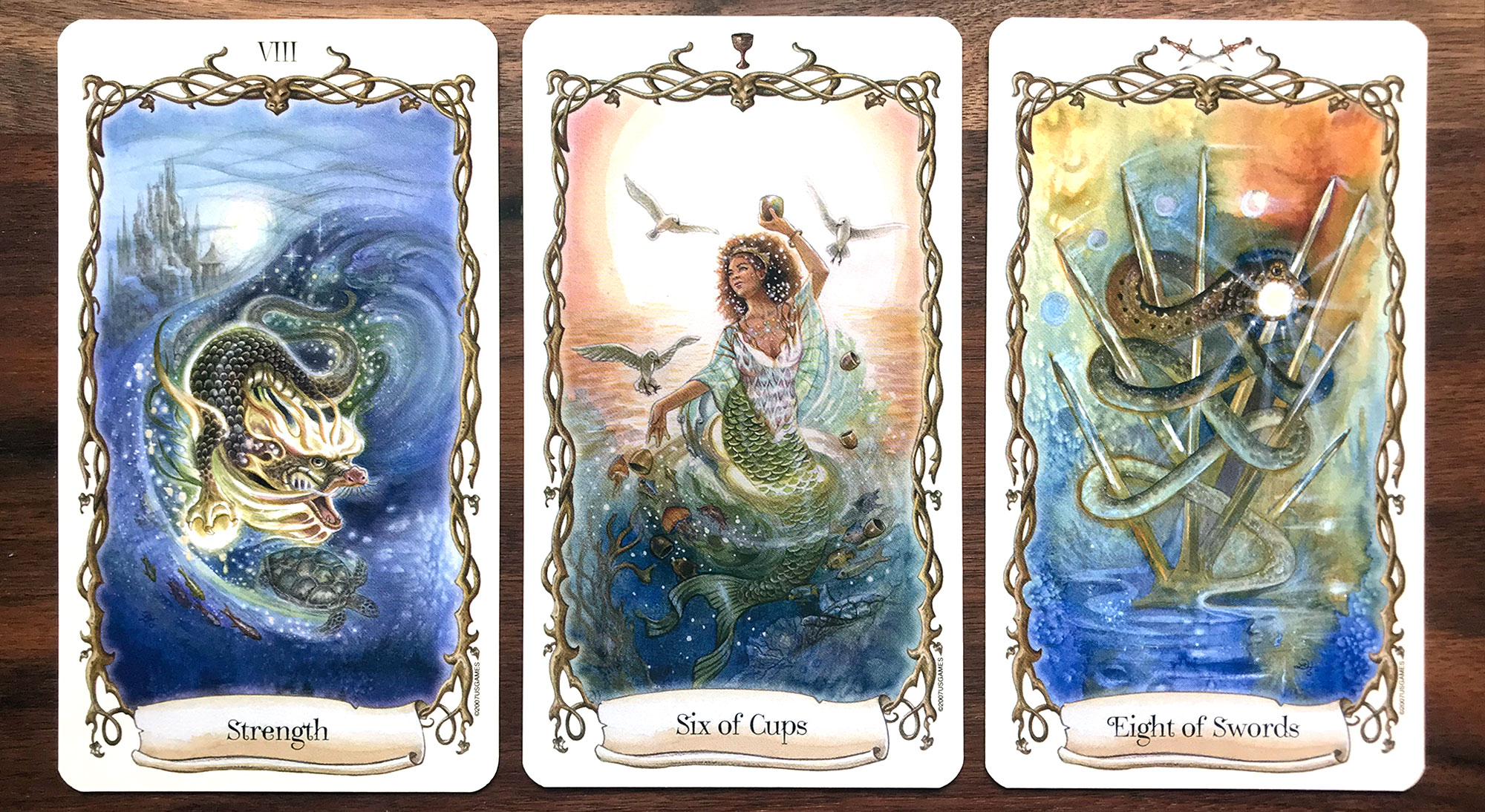 Reading Summary: Perseverance (Strength), staying present (Six of Cups), and not ignoring what’s right in front of me (Eight of Swords).