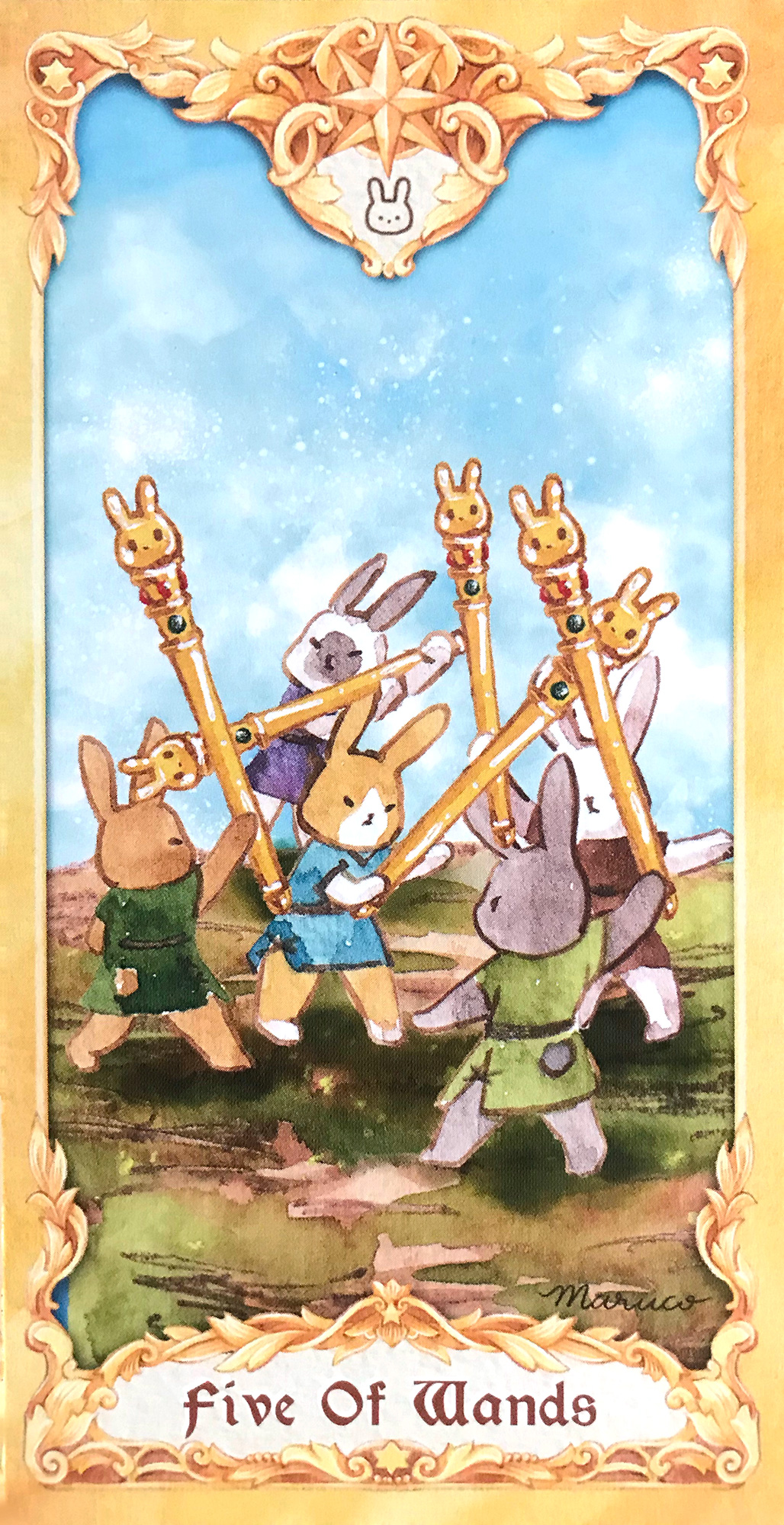 Today’s draw is the Five of Wands, which is traditionally a representation of tests, trials, and conflict concerning one’s passions, ambitions, and drive.