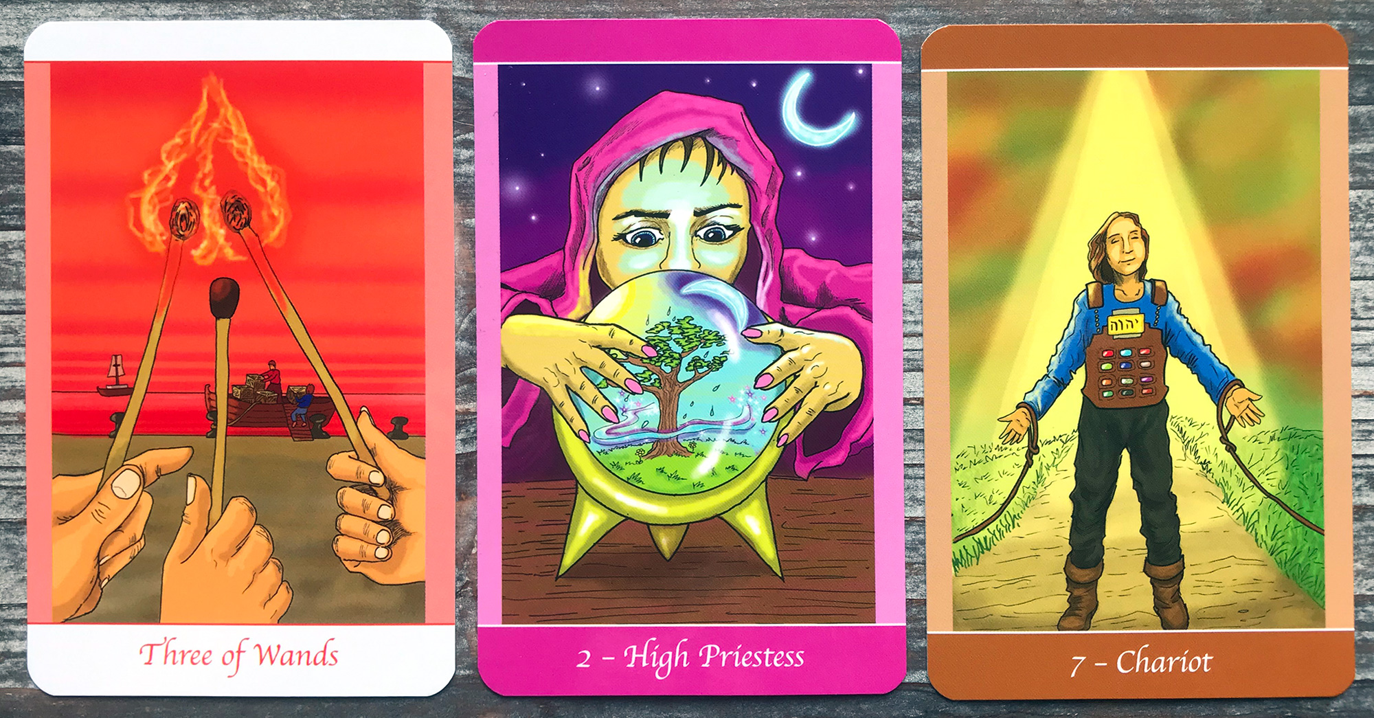 Reading Summary: Have a plan in place (Three of Wands), depend upon your intuition to guide you forward (High Priestess), and keep plowing forward (Chariot).
