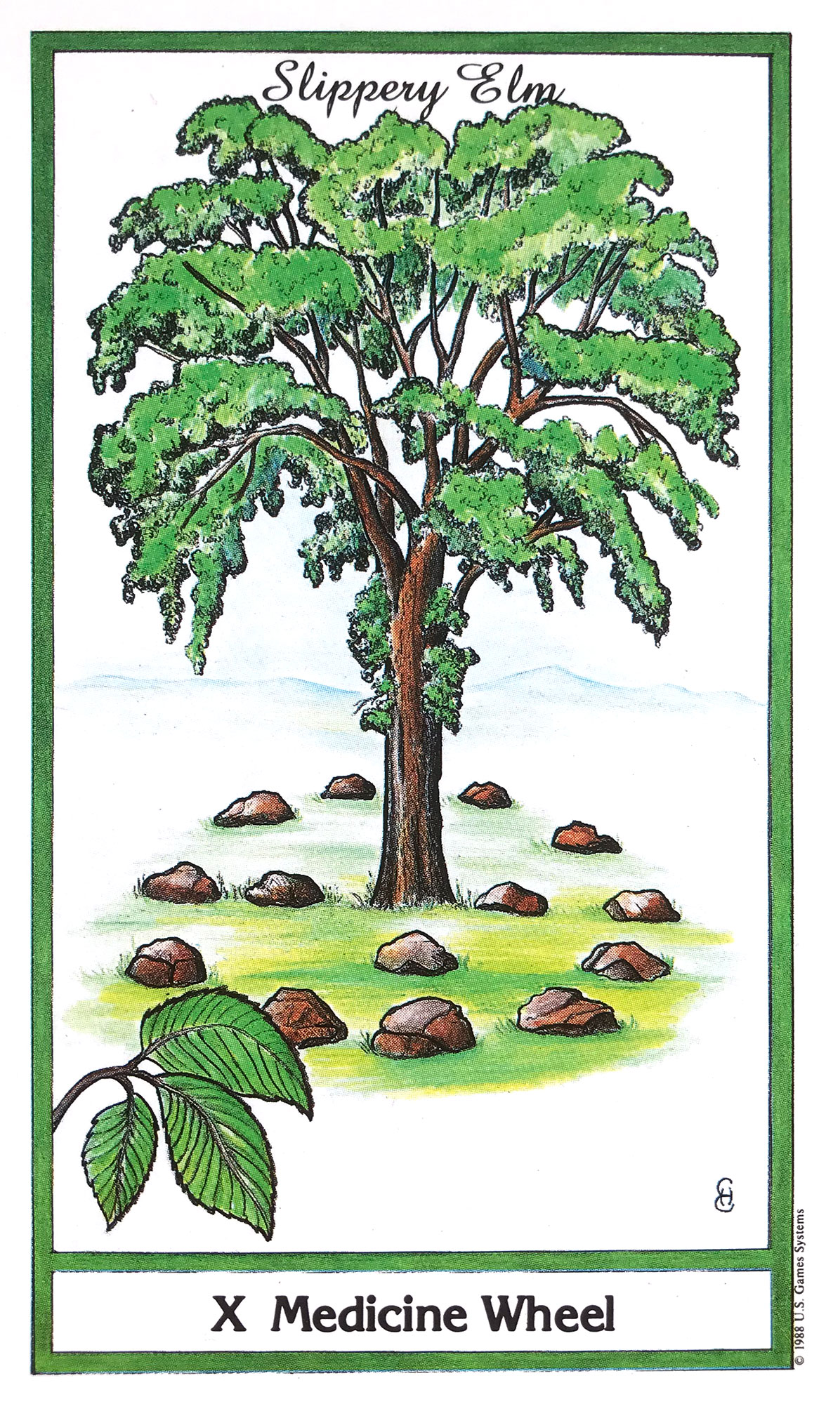 I think I’ve mentioned this before, but the Medicine Wheel reference on this card makes me a bit uncomfortable. This deck is very diverse… but it doesn’t tip into appropriation (IMO) anywhere but in this card and the use of the native wording on the card and references in the book. I don’t see the imagery on this card as a medicine wheel at all, but rather as a sort of faerie ring in stone around a mighty elm tree. I see incognito Fae encircling something respected and sacred.
