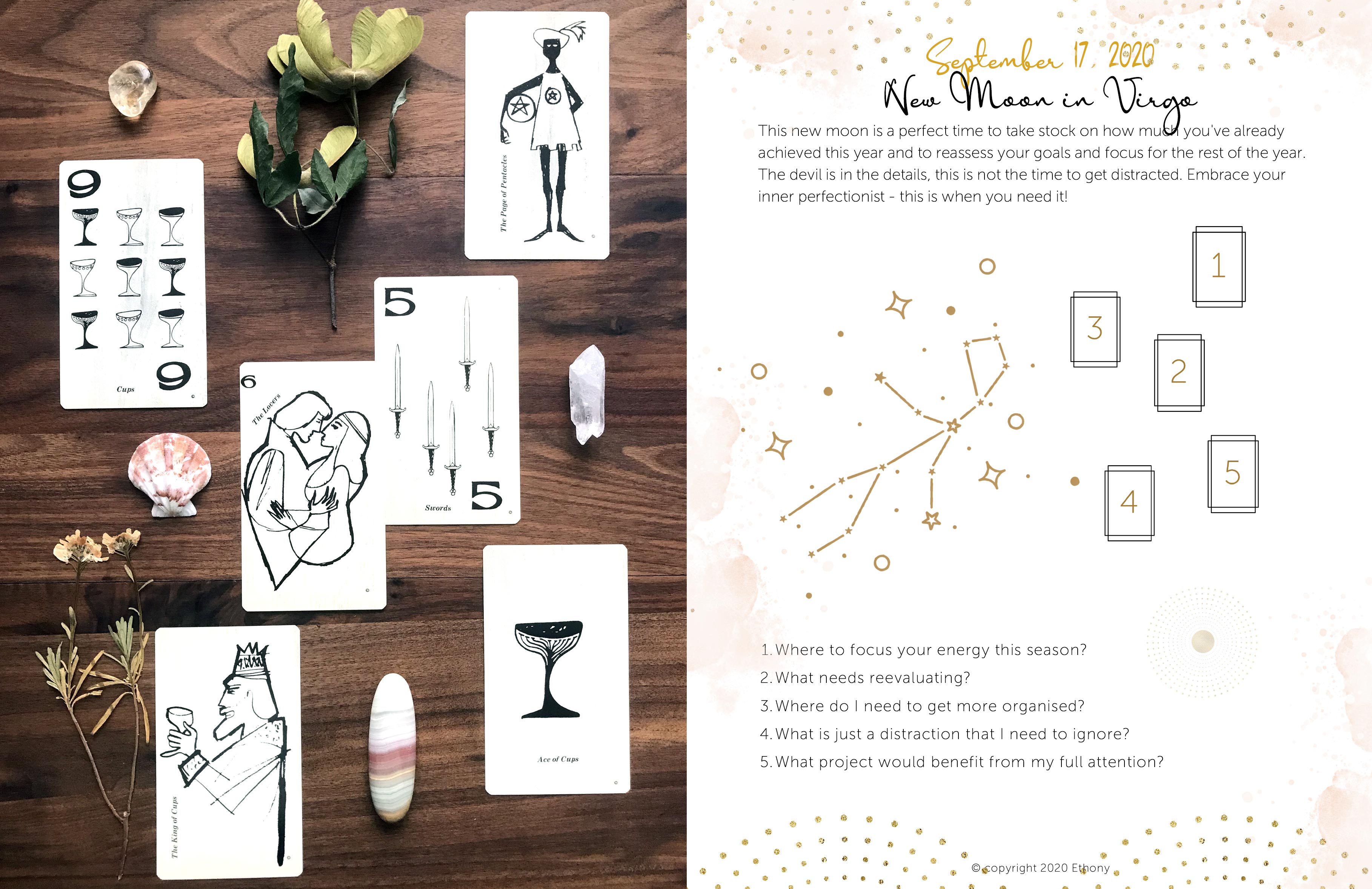 Today is the New Moon, and like all new moons and full moons, I did a spread aligned to the moon’s current themes as a part of my recognition of the moon’s cycle and influences upon us.  Today’s spread is brought to you by Ethony‘s Tarot By the Moon series.