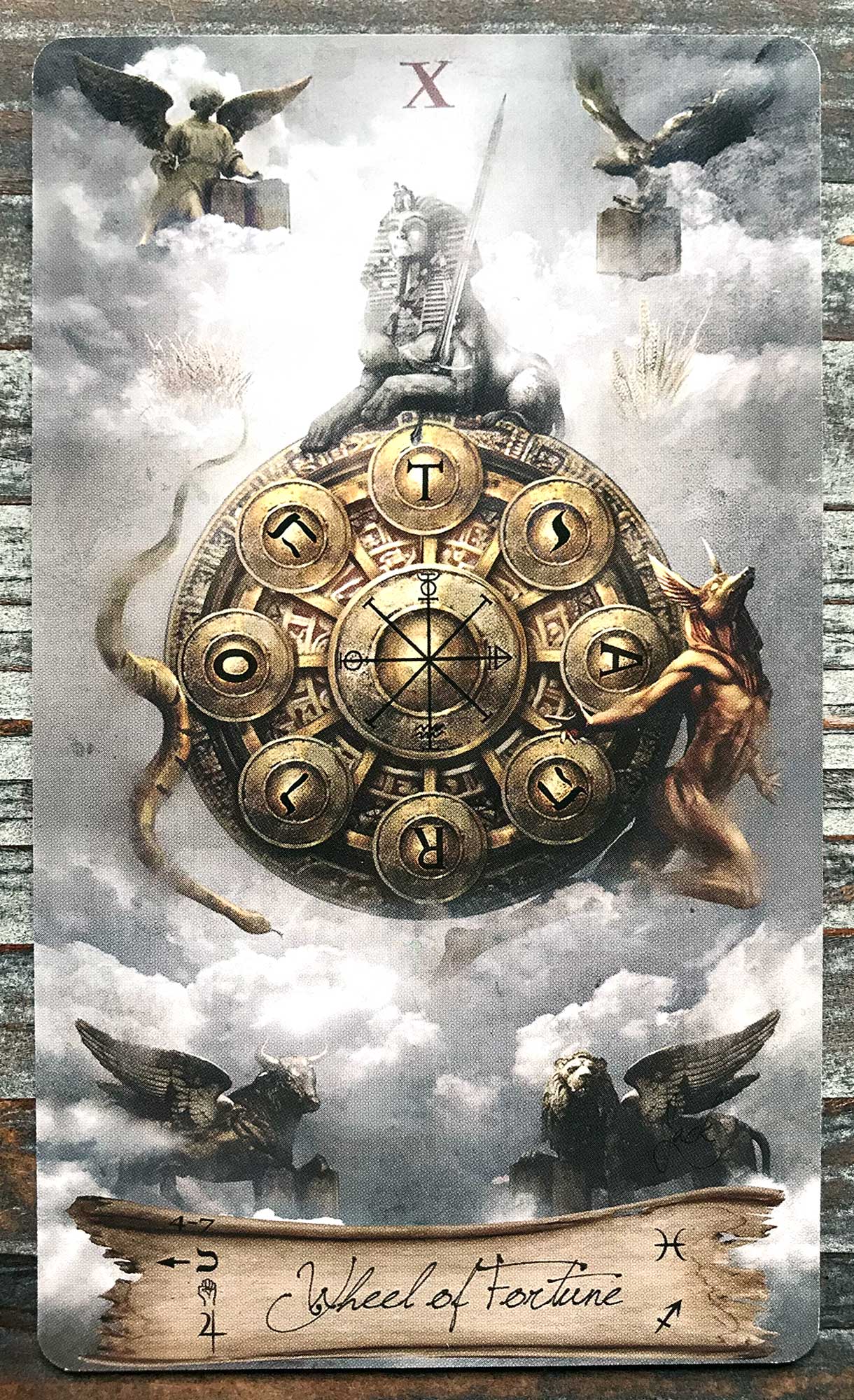 Heaven & Earth Tarot - Wheel of FortuneToday’s draw is the Wheel of Fortune, which is traditionally a representation of the ups and downs that life has to offer.  This is more than about good luck and bad luck, but about the “rollercoaster” of life and how things are never still or stagnant, but always moving and changing.