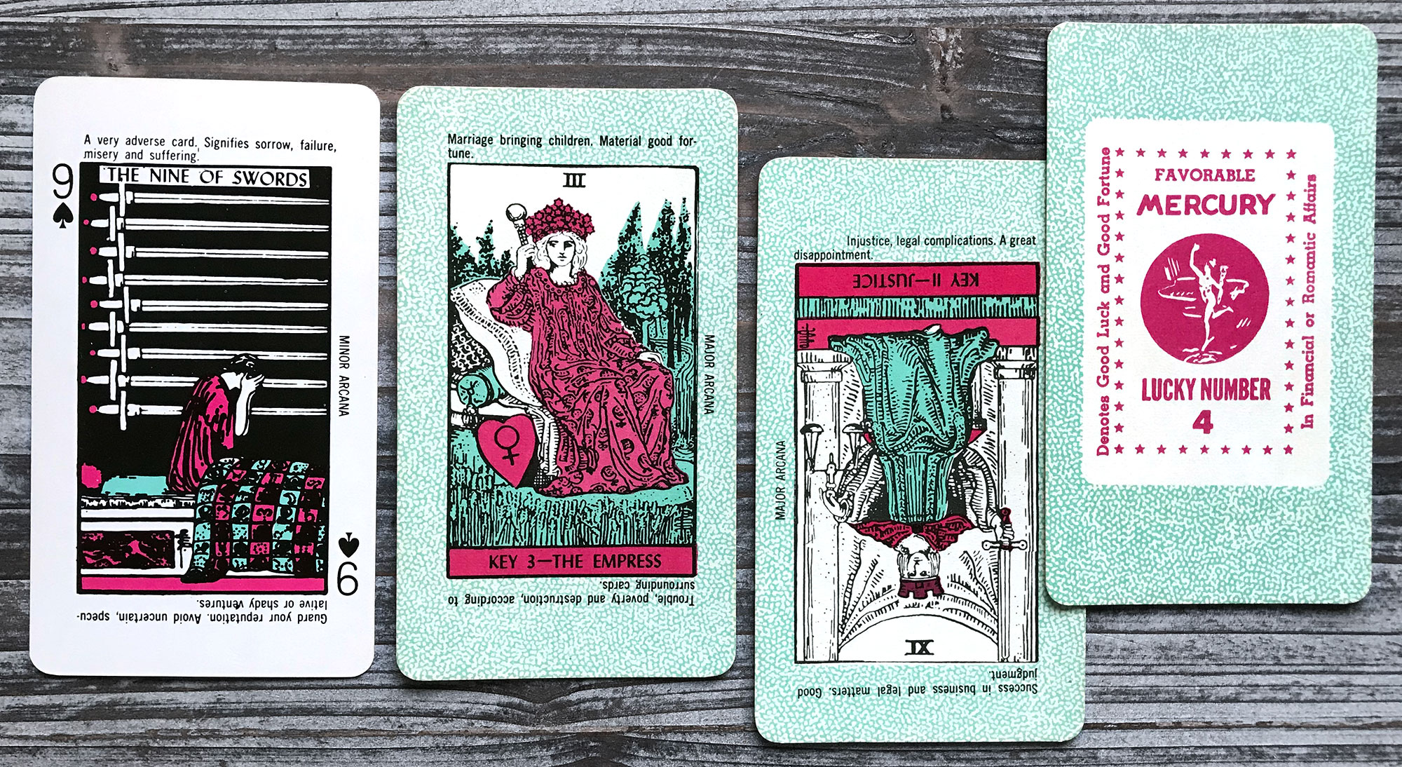 Reading Summary: The anxiety and depression that you’re feeling (Nine of Swords) requires some nurturing (The Empress) and that you seek out the positive as much as you can (Mercury) instead of focusing on the negative and letting it drag you down (Justice Rx).