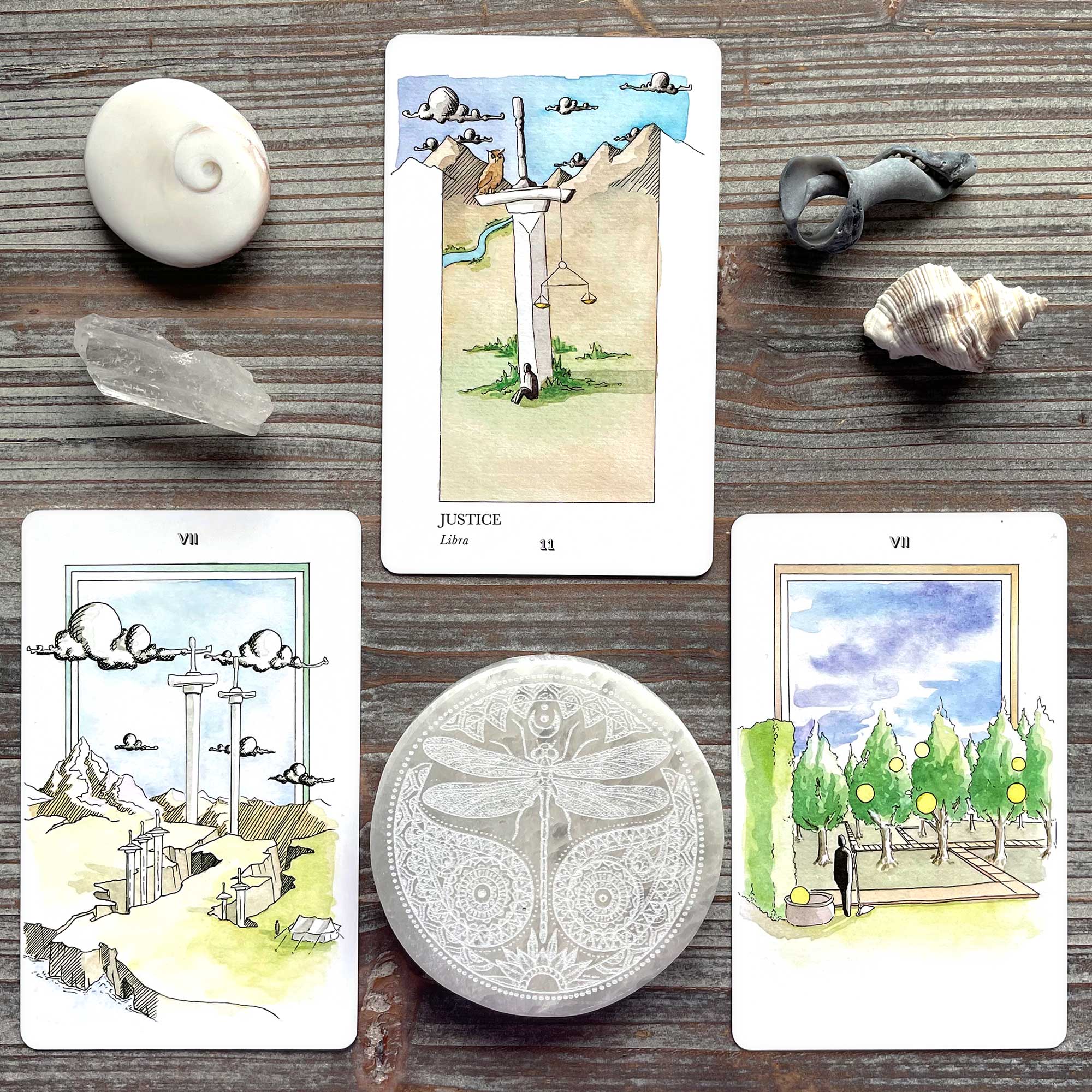 Reading Summary: If I’m clever with my time and efforts (Seven of Swords), I can tip the scales in my favor so that what I want to continue to grow will do so (Justice). It might not be the speedy growth I crave, but slow growth is better than no growth at all (Seven of Pentacles).