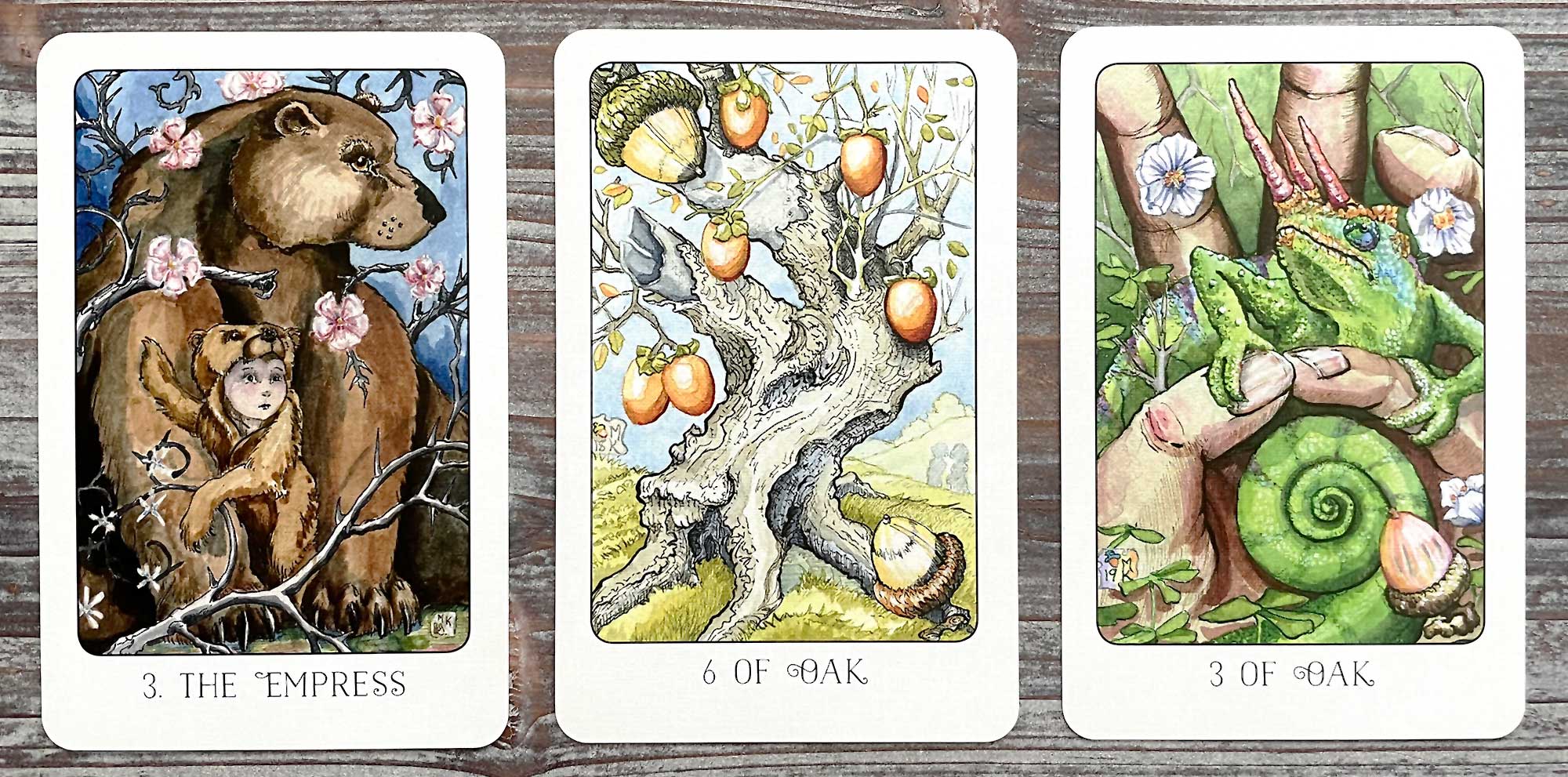 Reading Summary: In order to take better care of yourself (The Empress), you’re allowing others (Six of Oak) to play a larger role in your endeavors and responsibilities (Three of Oak).