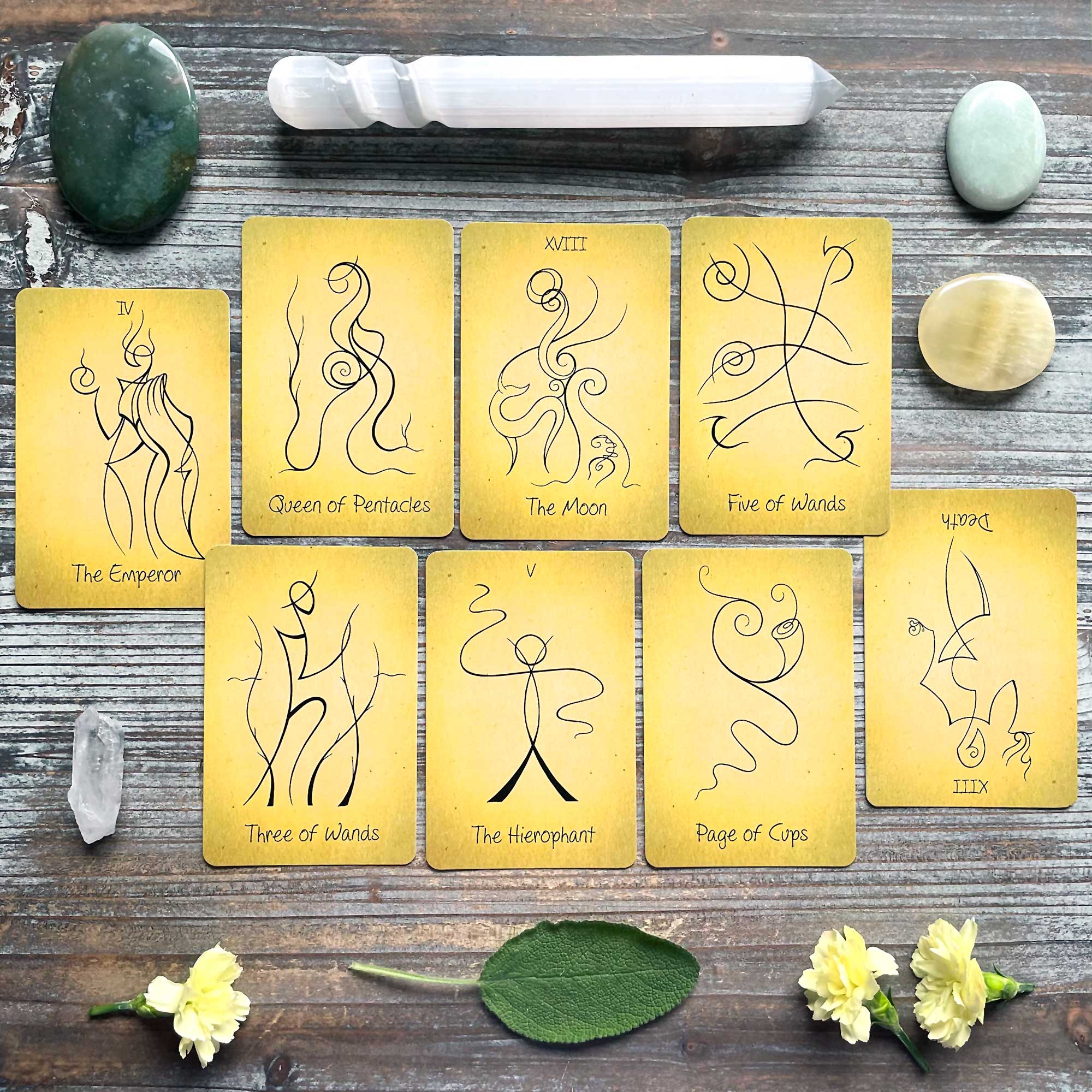 Queen of Pentacles, The Moon, Five of Wands atop Death