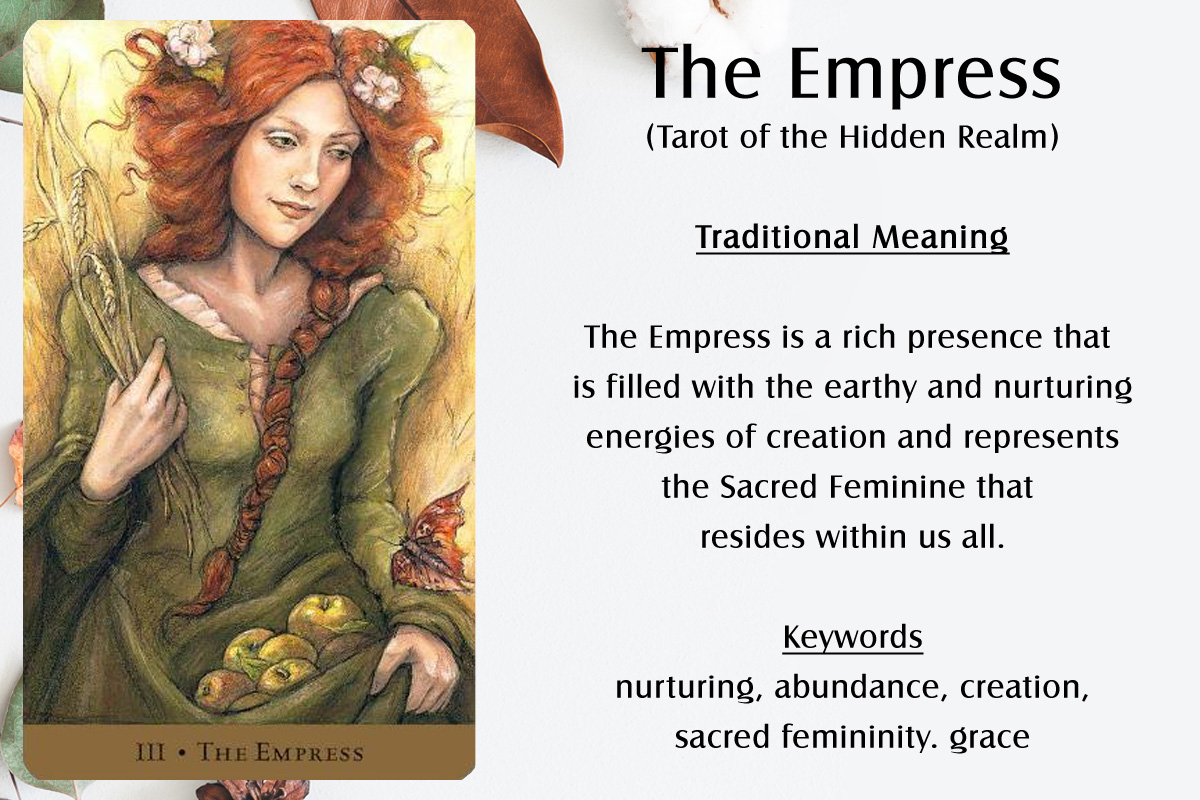 The Empress in the Tarot of the Hidden RealmTarot of the Hidden Realm – In this Empress we have the embodiment of inviting warmth and a bountiful harvest.