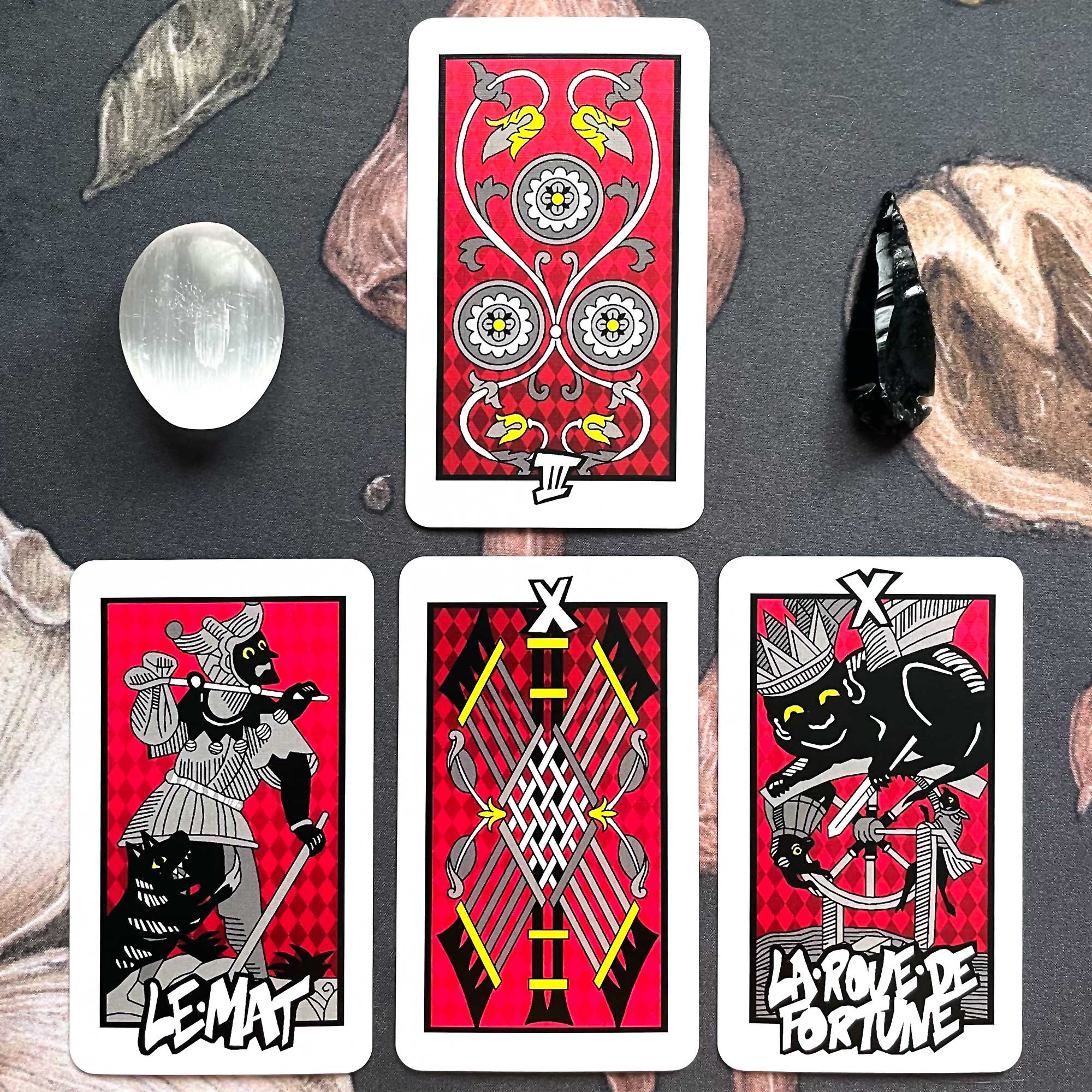 More of a sense of adventure in my work (Le Mat), and less overwhelm (Ten of Wands Rx) throughout the ups and downs that the future holds (La Roue de Fortune).