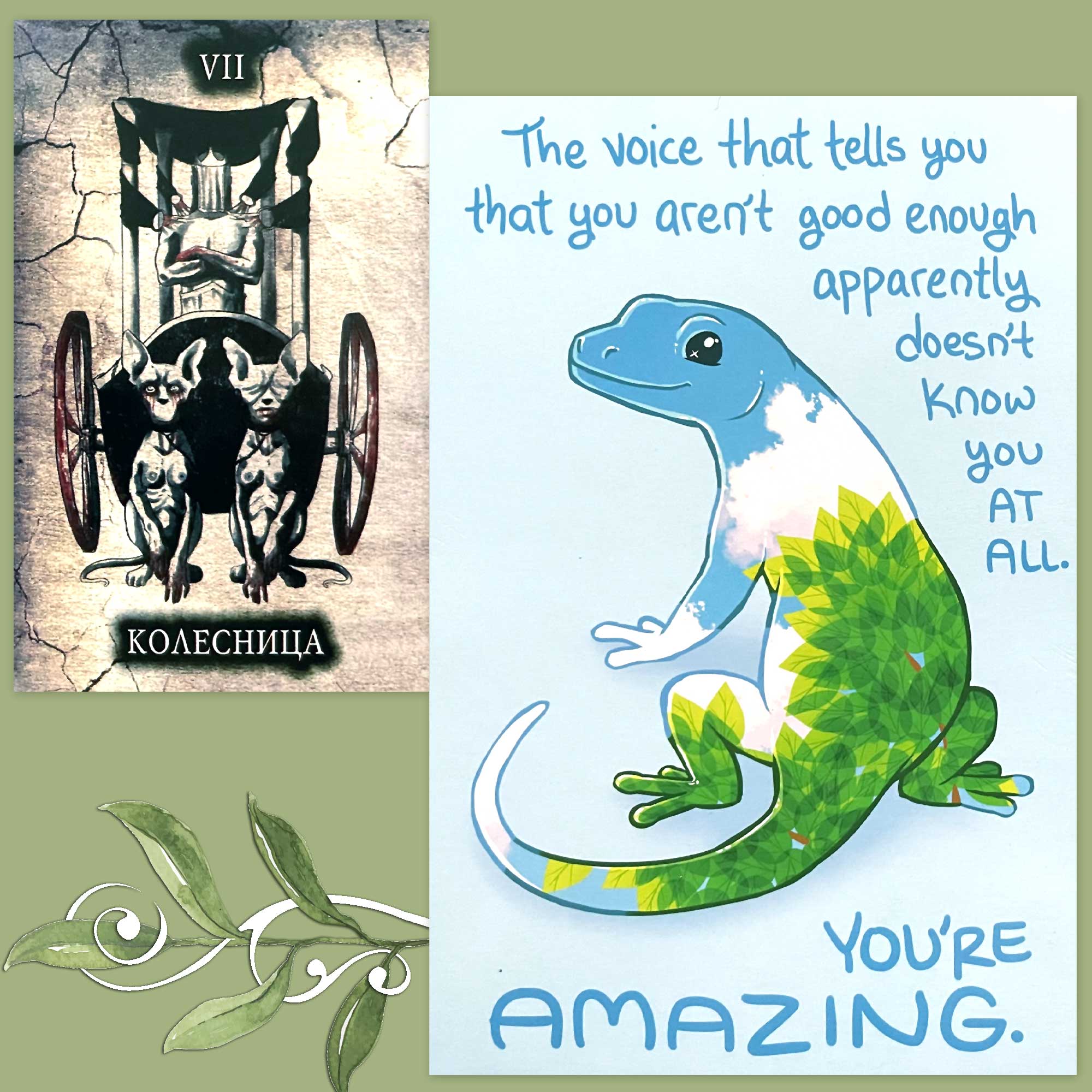 The combination of the Thera-Pets card joined with the Chariot speaks of rising above self doubt in order to acheive success.