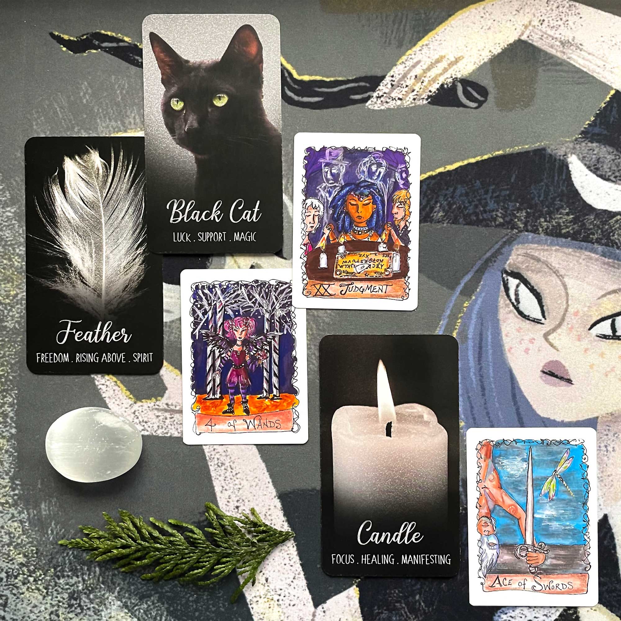 Black Cat atop Feather, Judgment atop Four of Wands