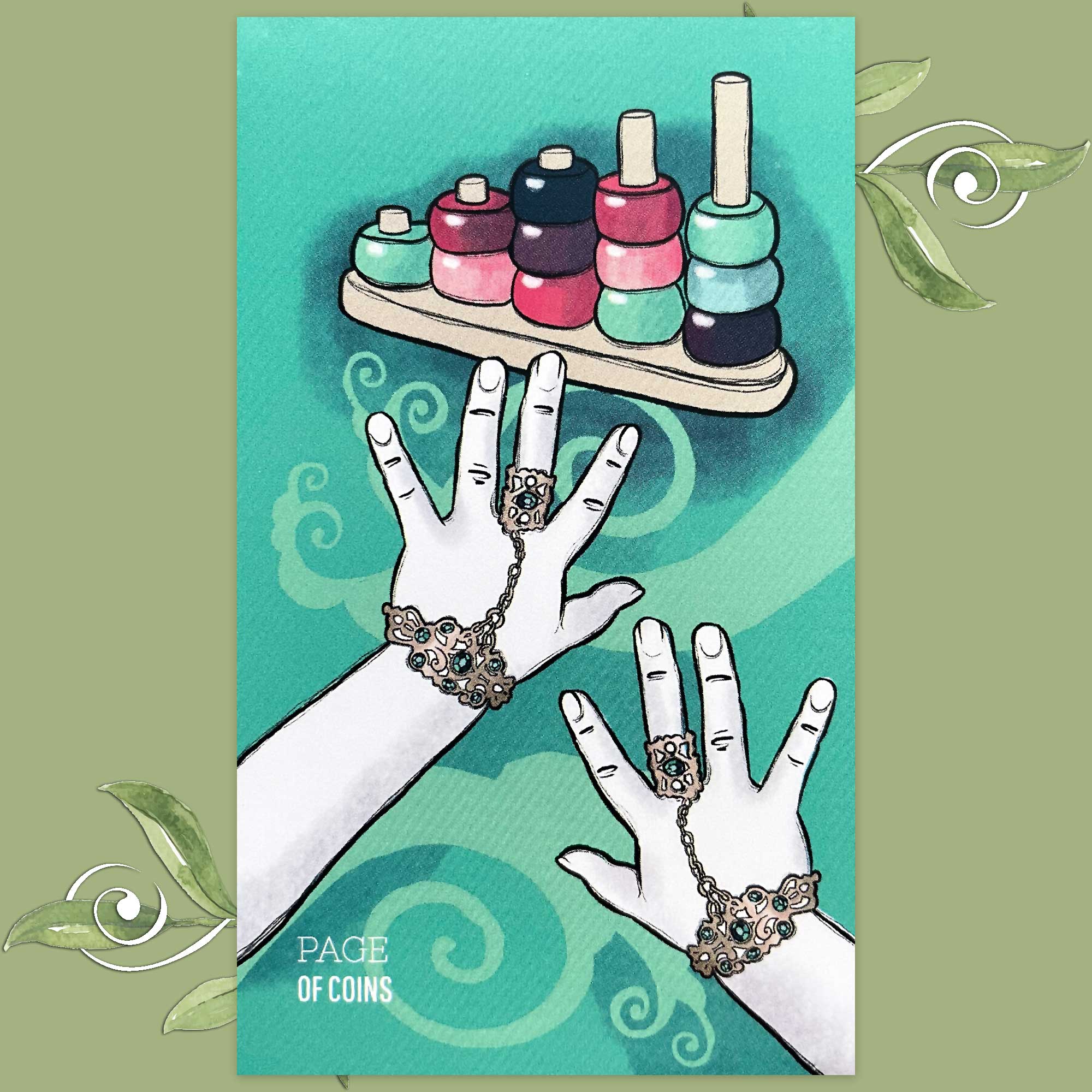 Today’s draw is the Page of Coins, which is traditionally a representation of a receptive omega energy, personality, or person in the area of one’s finances, resources, health, home, and manifestations.