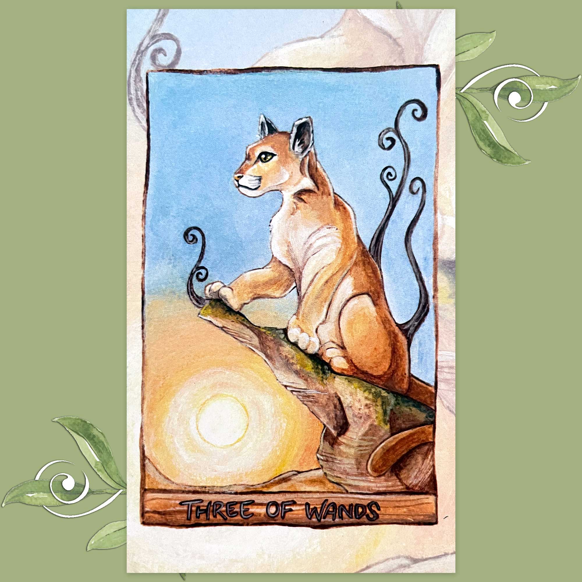 In the imagery of this card, a mountain lion observes the rising sun and plots its course forward into the world. And with the plotting done? The cat rises and flexes in preparation for the leap forward that would set things in motion for the day.