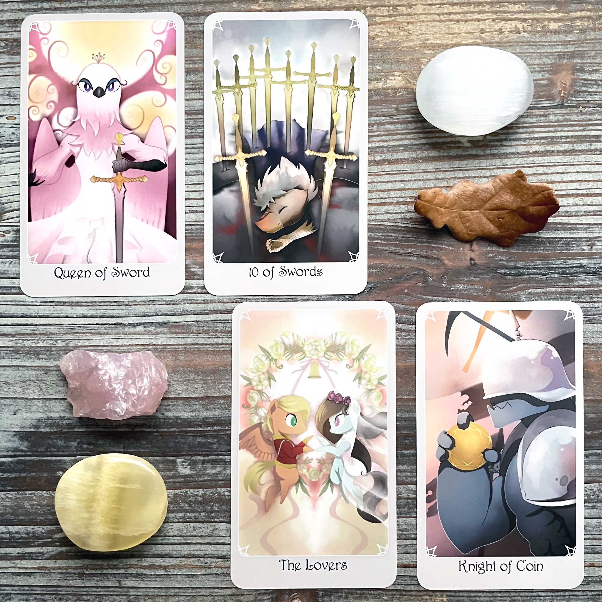 The Lovers and Knight of Coins – Make good choices that further a solid foundation and grounded strength. Don’t rush. Instead, take things slow and steady, and do them right the first time.