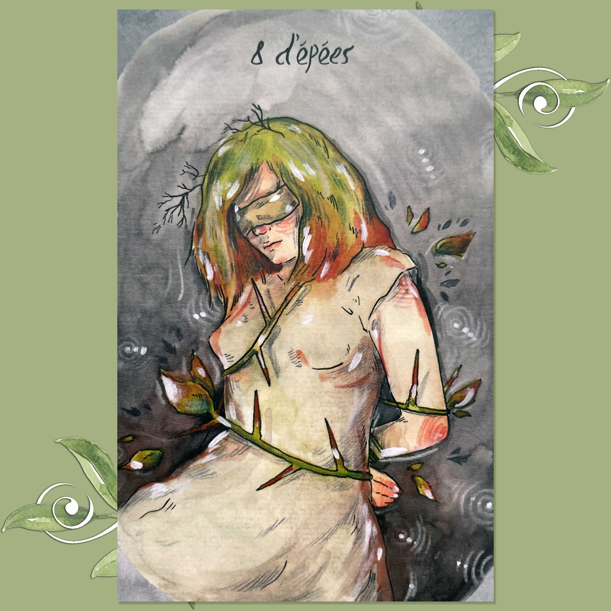 The figure in the imagery of this card looks as if she is injured and bleeding. There are thorns upon her bindings, and red taints the skin, hair, and even the thorns themselves.