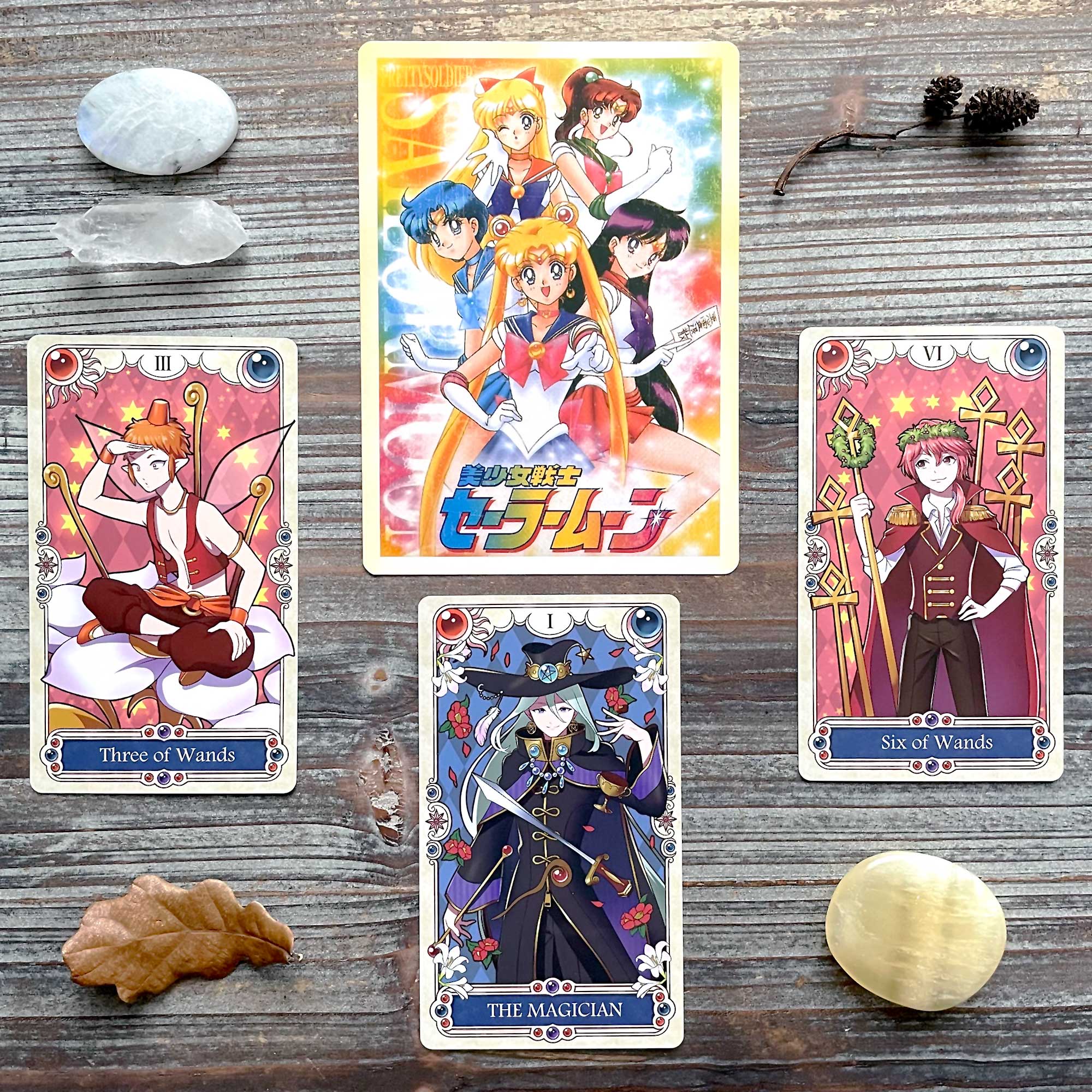 Furthermore, the character in the Six of Wands it’s looking directly up into the Sailor Moon card and all of the characters collected there, drawing attention to the fact that comrade can be a powerful motivator. The Three of Wands, meanwhile, is looking away and towards the past as if to say you can’t depend on others for everything when following your own path.