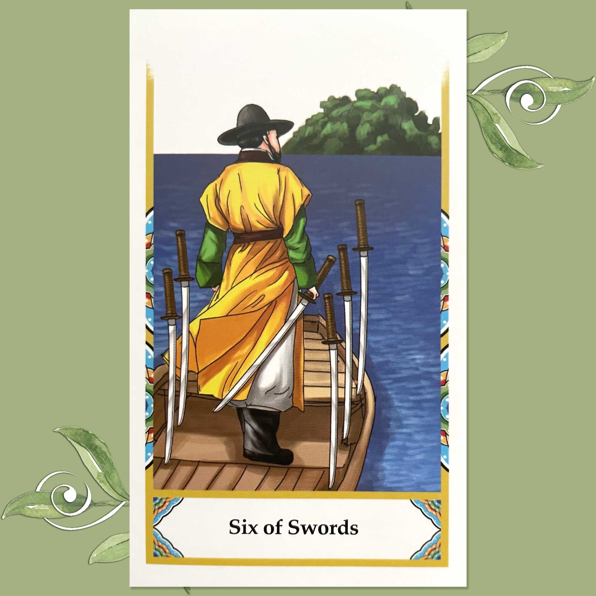 Today’s draw is the Six of Swords, which is traditionally a representation of moving on, leaving behind difficulty for something better, and letting go.