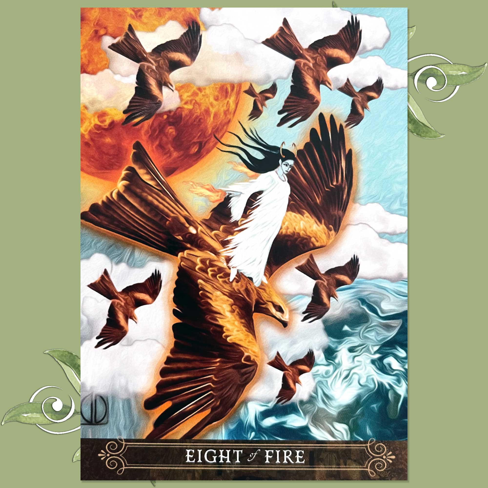 In today’s card, we are invited to look in our lives for those things that are requiring our immediate attention. What needs started or done now? What can’t be put off? The Eight of Fire invites us to examine these things, but also to take action to deal with them as well.