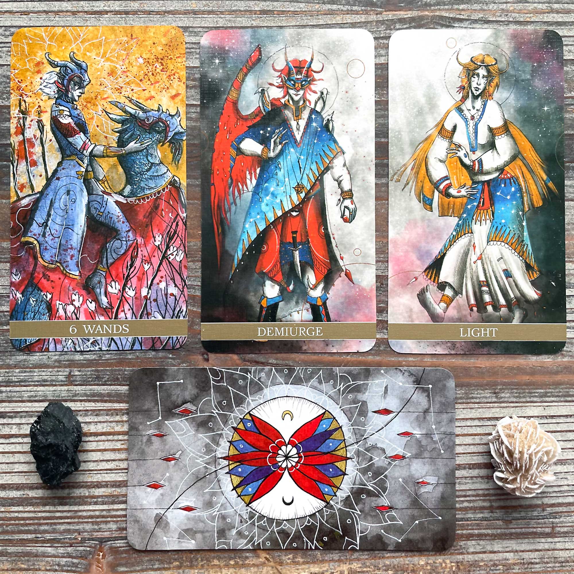 What stands out to me in the imagery of this card is the little figure trapped inside the globe down at the Magician’s knee. This small figure… are they protected? Or are they trapped? They watch the Magician create while caught beneath glass, and I am left asking…. why? Why is the figure caught there under glass? Why are they not free, and what purpose do they hold in the Magician’s plans?