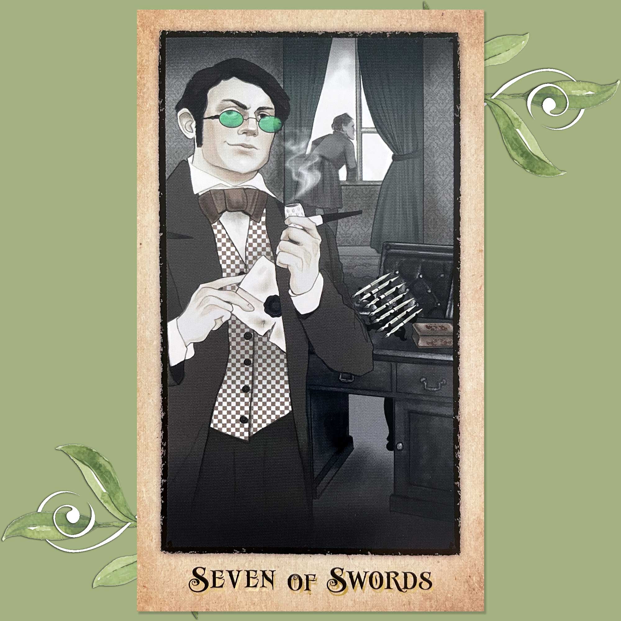 Today’s draw is the Seven of Swords, which is traditionally a representation of strategic thinking, “sneaky shit”, or getting away with something. It can also often be about taking only what one can carry.