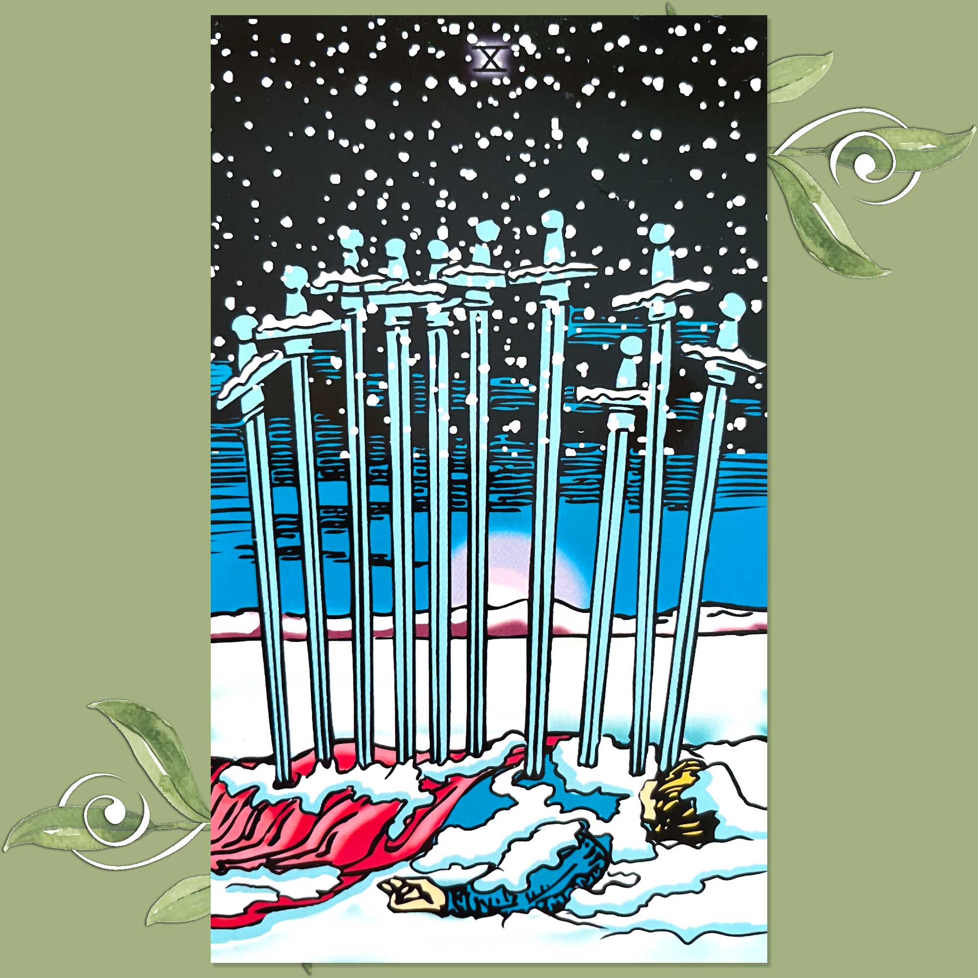 Today’s draw is the Ten of Swords, which is traditionally a representation of the end of a painful journey and other painful endings, the pain of betrayal, and moments of loss or defeat.