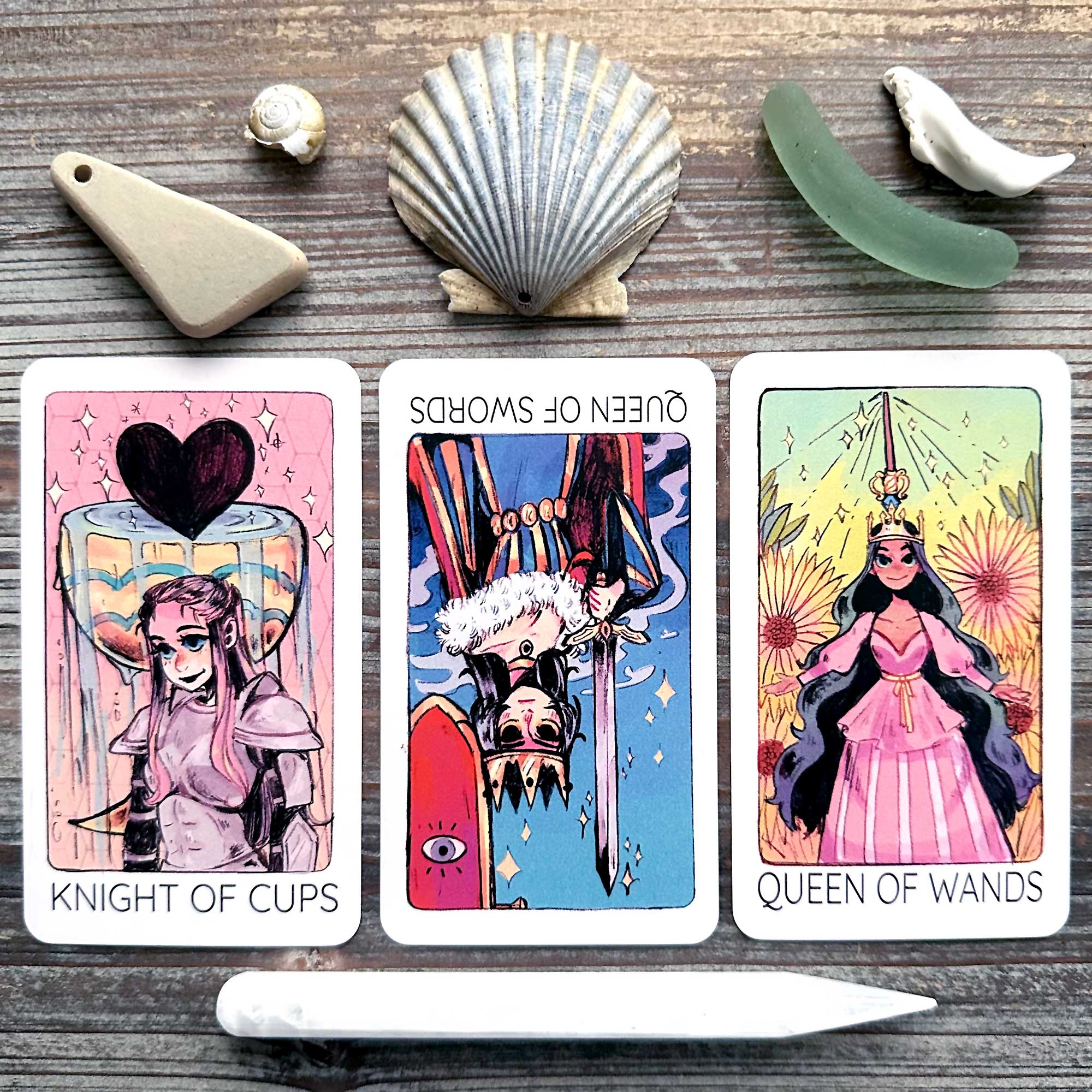 Reading Summary: You feel like you are falling short on going after what interests that make you happy (Knight of Cups and Queen of Wands), because your negative inner narrative shames you into more responsible tasks (Queen of Swords Rx).
