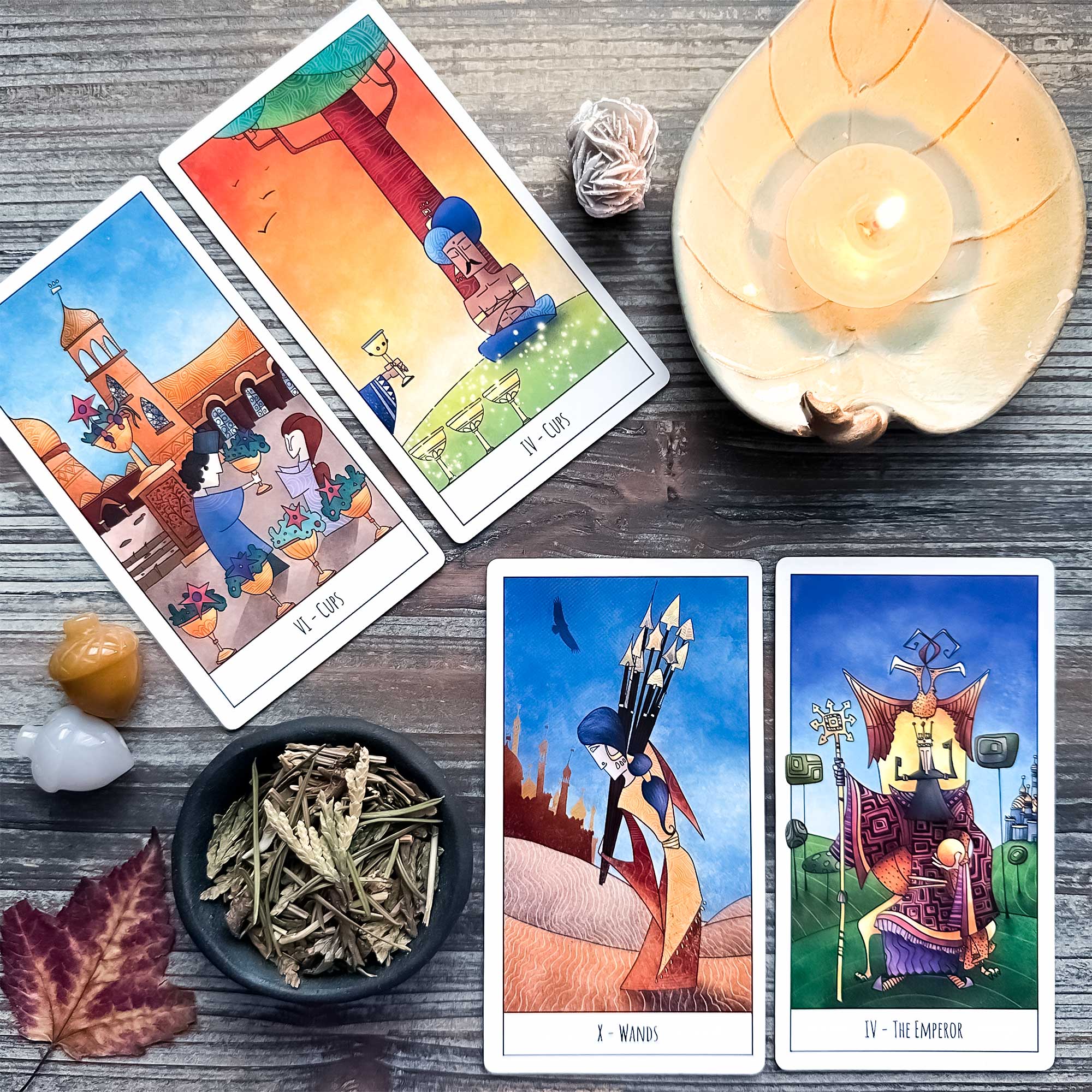 Ten of Wands atop The Emperor – In order to make good decisions for yourself and others, and not feel overwhelmed by it all, you need the balance that meditation provides as well as the stronger connection it provides you to your intuition.